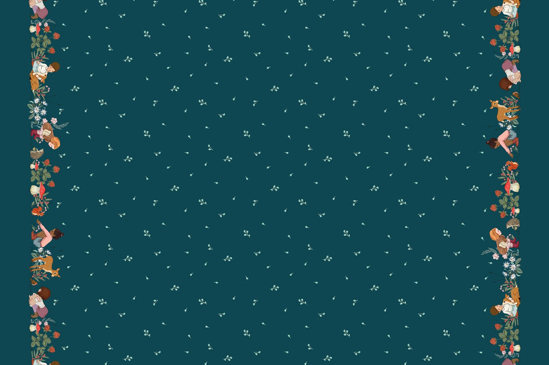 This print is a double border featuring children interacting with animals along the edges, with scattered blossoms throughout a dark green background. Perfect for quilt backs and tablecloths. 100% Cotton, 44" Wide.