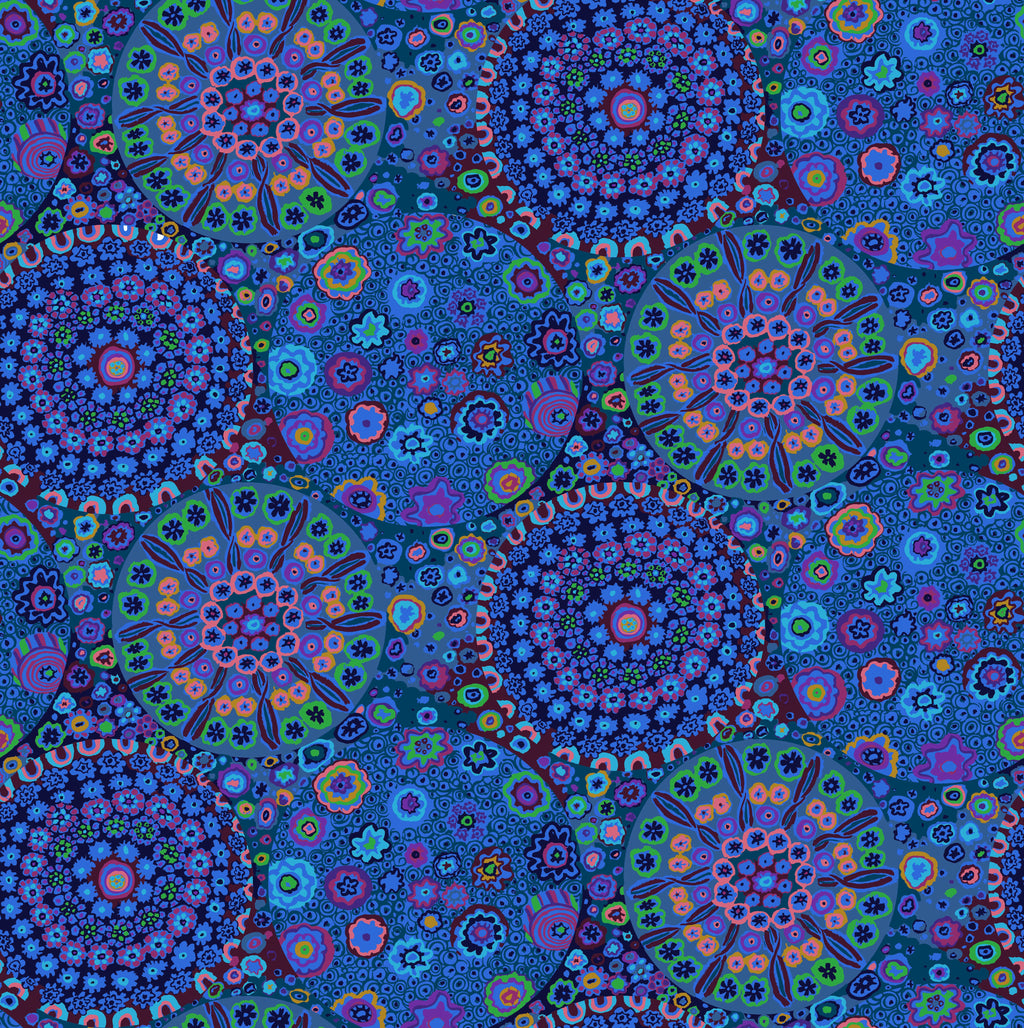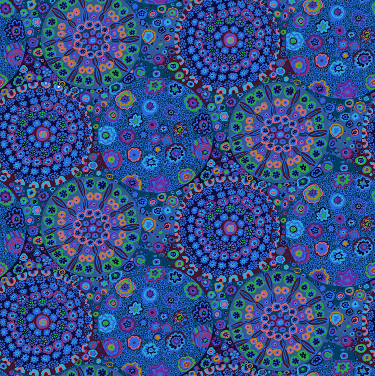 This 108" wide backing fabric by Kaffe Fassett showcases layered circular medallions in rich blues with vibrant accents throughout. The saturated palette gives this classic Millefiore design depth and energy while remaining balanced as an allover backing. Printed on 100% cotton sateen, it offers a smooth hand and subtle sheen, making it an excellent choice for quilts where the backing is meant to stand out.