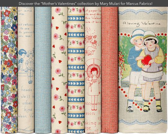 "Mother's Valentines" by Mary Mulari captures the charm of vintage Valentine's Day cards with sweet floral motifs, delicate hearts, and nostalgic script elements. In a romantic palette of pinks, reds, and pastels, this collection is perfect for heartfelt quilts, gifts, and holiday décor.