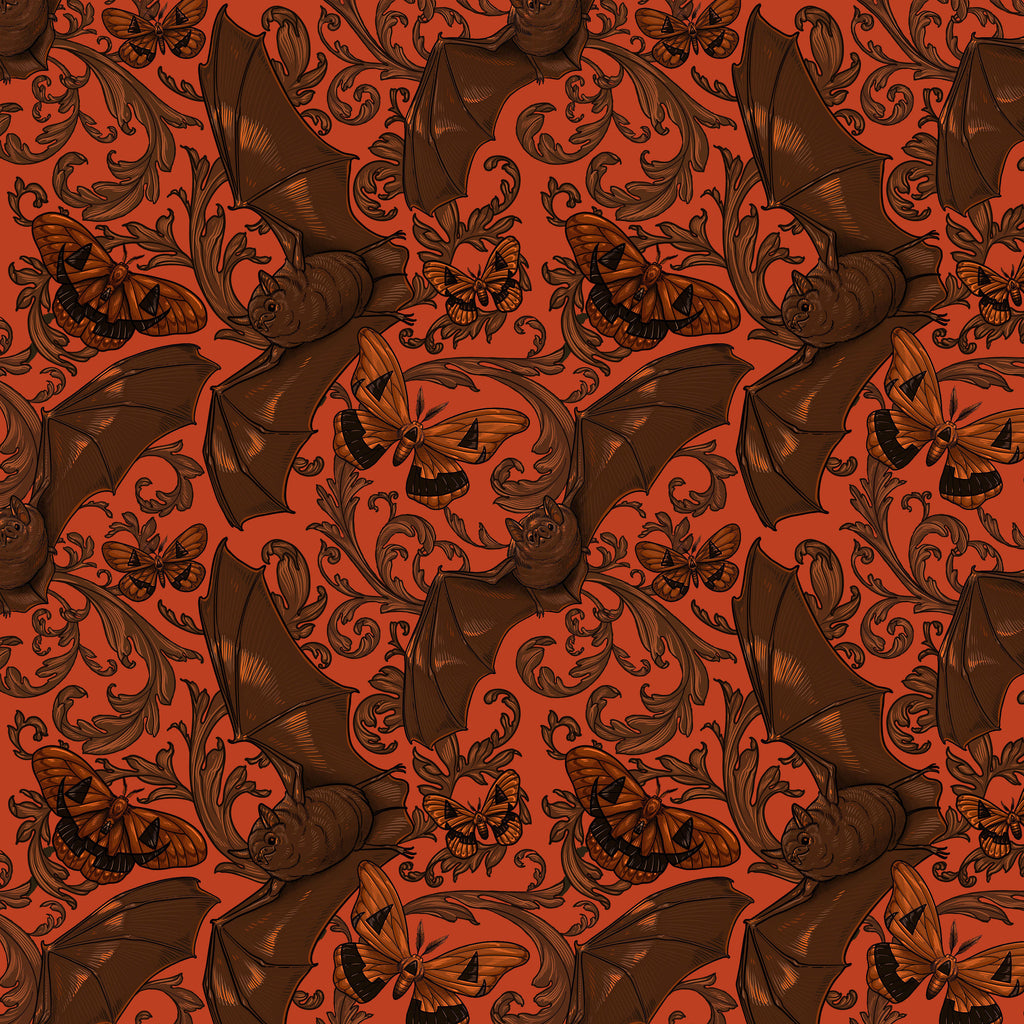 The Mystic Moonlight collection  is inspired by an old home that's very loved and very haunted. Imagine the antique dark wallpaper peeling with age from the walls. As you look at the damask, your eyes play a trick on you - was that a skull in the pattern? Maybe there is an owl who has taken residence in the attic and some black cats that are chasing the moths that live in the dusty rafters. There are overgrown gardens and lots of collections, all by the light of a friendly moon. Would you go inside?