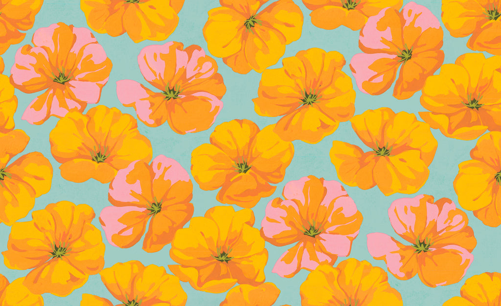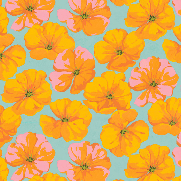This 100% cotton print features bold, painterly poppies in vibrant shades of orange and coral, blooming across a soft, warm background. The loose, expressive brushstrokes capture the delicate movement of poppy petals, giving the print a lively, sun-soaked feel. This fabric brings a burst of summer energy and natural beauty to any project—perfect for statement quilts, wall hangings, or garden-inspired home decor.