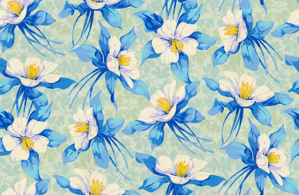 This 100% cotton print showcases delicate columbine flowers in soft shades of blue, lavender, and periwinkle, layered over a pale sky-blue background. The painterly brushstrokes and subtle detailing give the print a light, airy feel—like a gentle breeze passing through a blooming garden. This soft, serene floral is perfect for spring or summer quilts, apparel, or calming home decor accents.