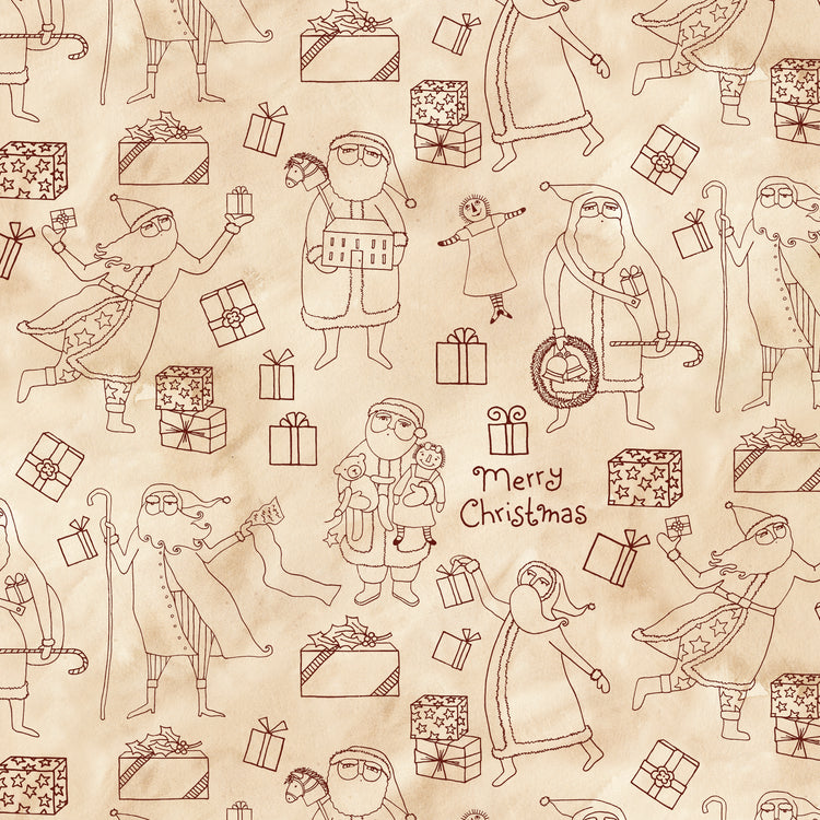 This 108" wide quilt backing features a festive scene of folk art Santas in playful poses, each surrounded by classic holiday gifts and accents. Set against a warm parchment background, the design blends vintage charm with whimsical detail, making it a standout choice for finishing holiday quilts or creating cozy seasonal décor.