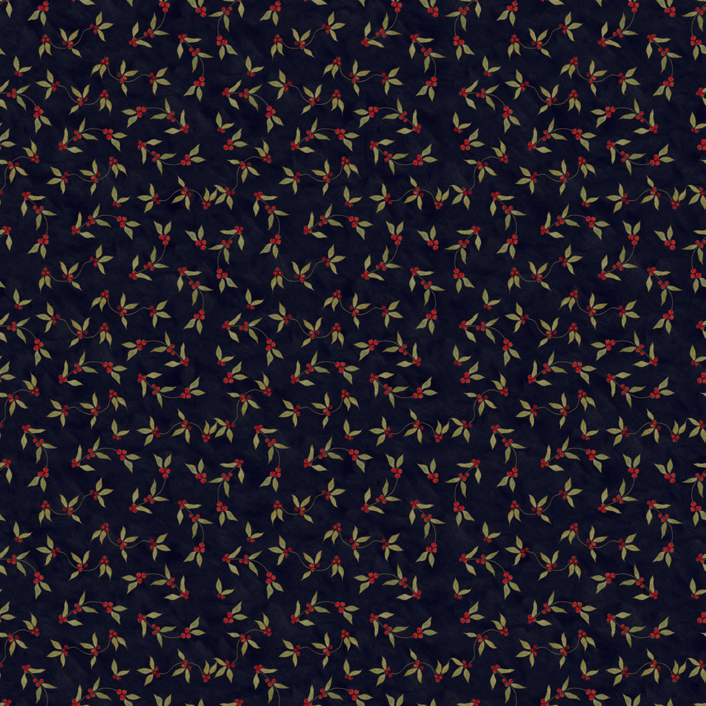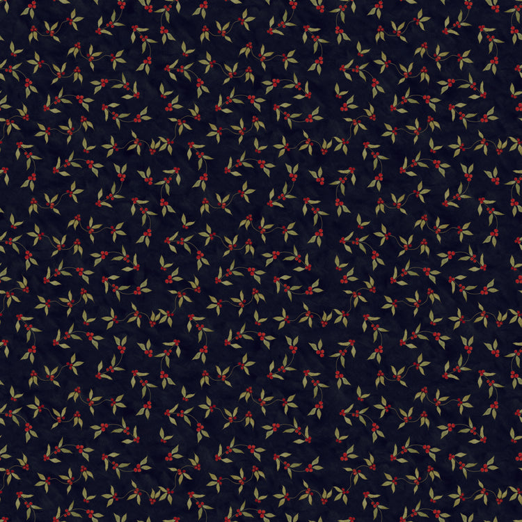 Delicate holly sprigs are scattered across a black background in this elegant holiday blender. The small scale and traditional palette make it a timeless staple for holiday sewing.