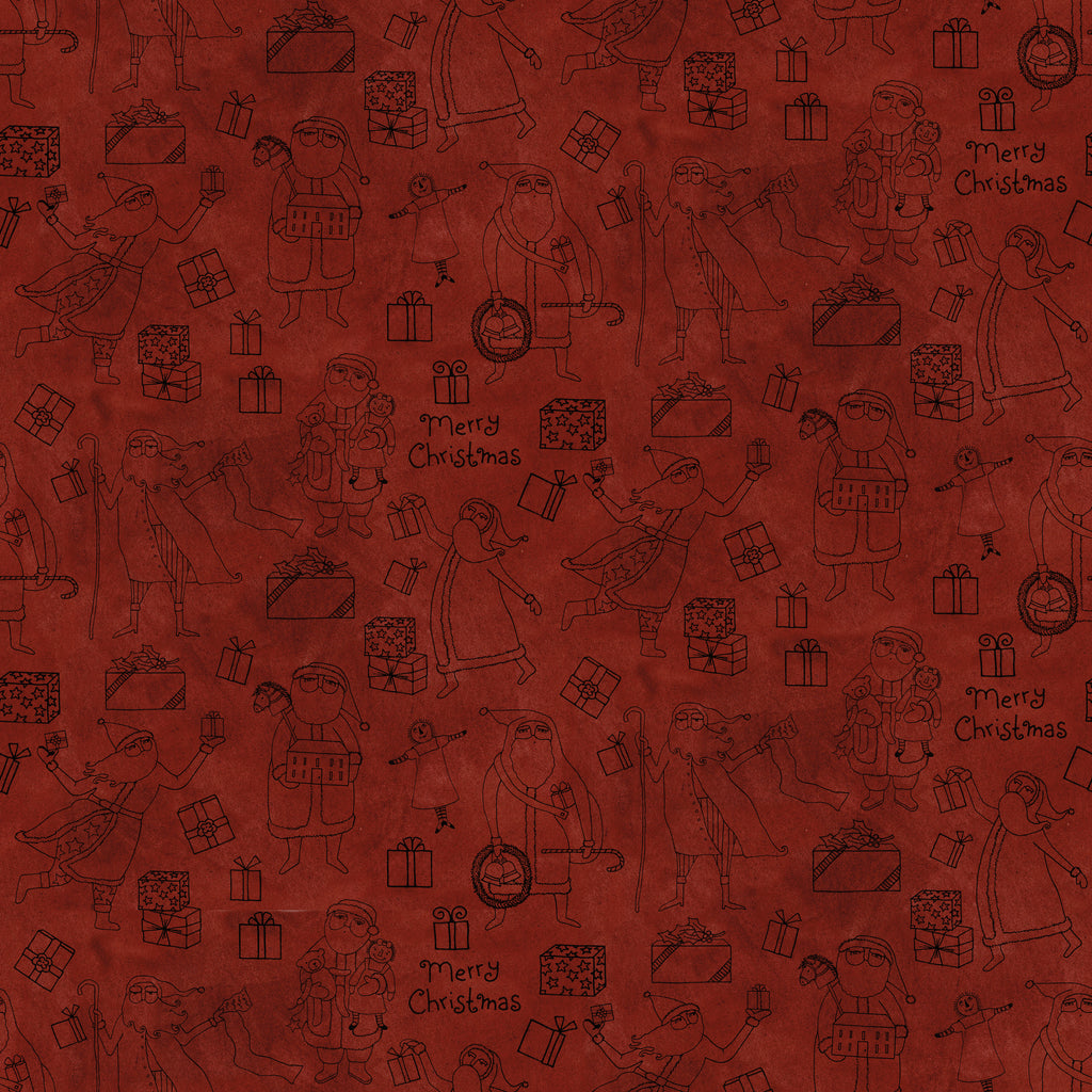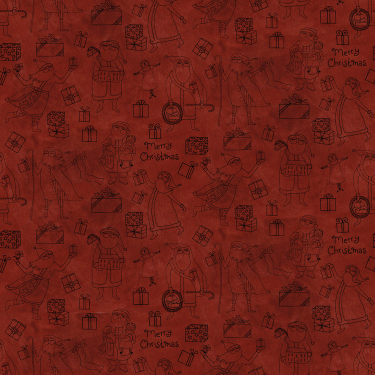 This deep red tonal print features hand-sketched Santas and gifts in a subtle monochromatic design. Adds warmth and visual interest without overpowering a quilt layout.