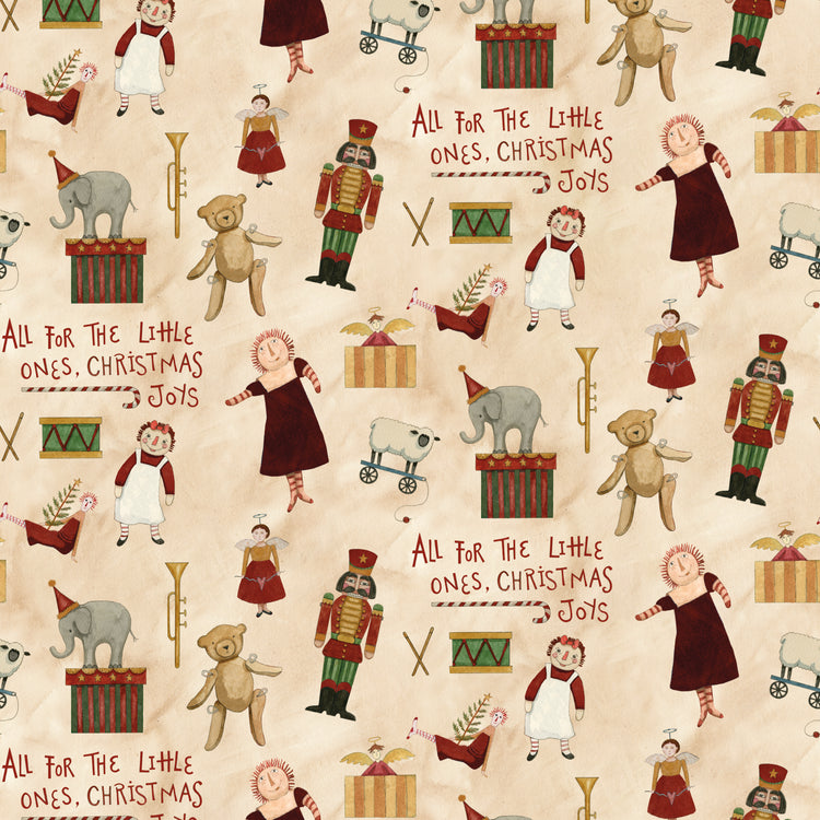 Set against a creamy parchment background, this playful toy print feels like a page from a vintage picture book. Gentle tones balance the cheerful motifs for a soft, timeless look.