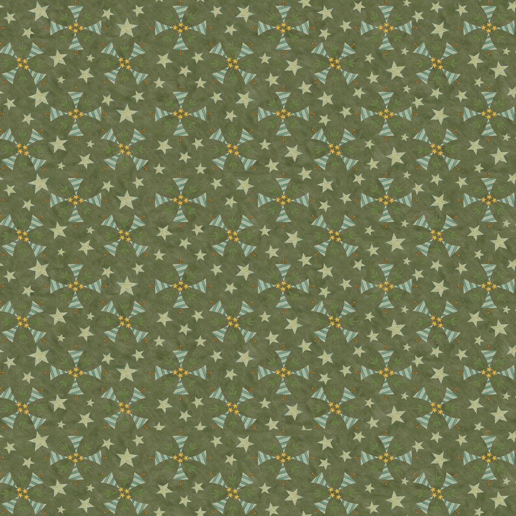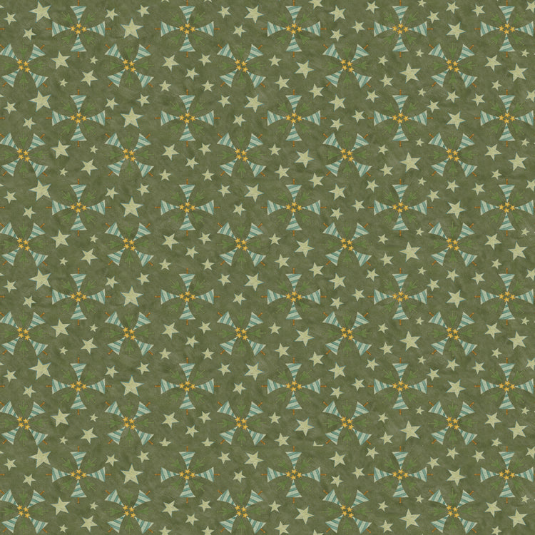 A soft, earthy green serves as the base for primitive tree shapes arranged into subtle stars and pinwheels. The tone-on-tone palette gives this print the feel of a textured blender with a hint of holiday charm.
