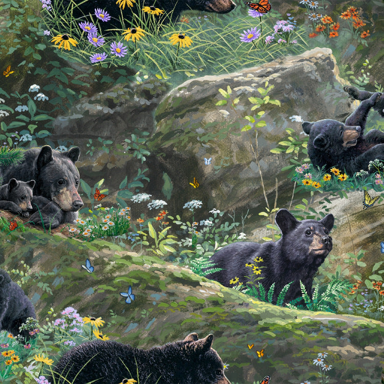 This fabric captures a heartwarming woodland scene featuring a mother bear and her playful cubs. Set in a lush forest with vibrant wildflowers and dappled sunlight, this print beautifully depicts the bond between the bears as they explore their surroundings. With its rich colors and lifelike details, this design is perfect for nature-inspired quilts, home décor, and crafting projects that celebrate wildlife and the great outdoors.