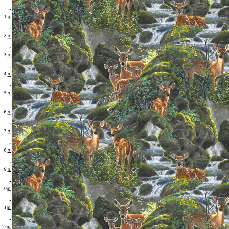 This fabric features gentle spotted deer resting in a lush forest clearing. Surrounded by soft greenery and wildflowers, this peaceful design captures the quiet magic of wildlife in its natural habitat. With its painterly detail and soothing palette, it's perfect for nature-inspired quilts and home décor that brings the calm of the forest indoors.