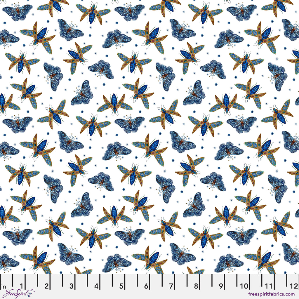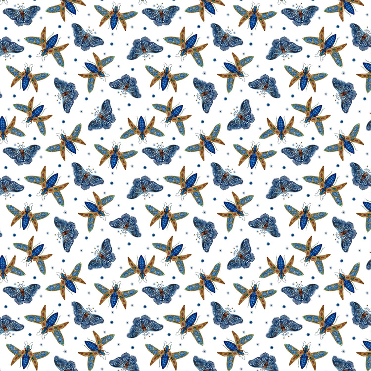 This 100% cotton print features beautifully detailed moths and butterflies in rich blues and golden accents, scattered across a crisp white background. The small to medium scale makes it an eye-catching yet easy-to-use motif for quilts, bags, and accents. A lively, nature-inspired design that brings movement and a touch of magic to any project.