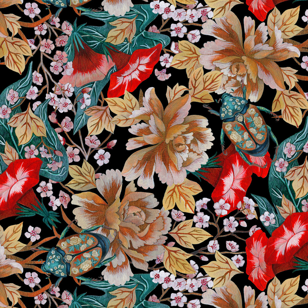 This 100% cotton print features ornate beetles, warm gold florals, and rich red blooms arranged against a deep black background for a bold, dramatic look. The detailed artwork and layered color palette give it an elegant, slightly vintage feel, making it a striking choice for standout quilt blocks, bags, and decorative projects.
