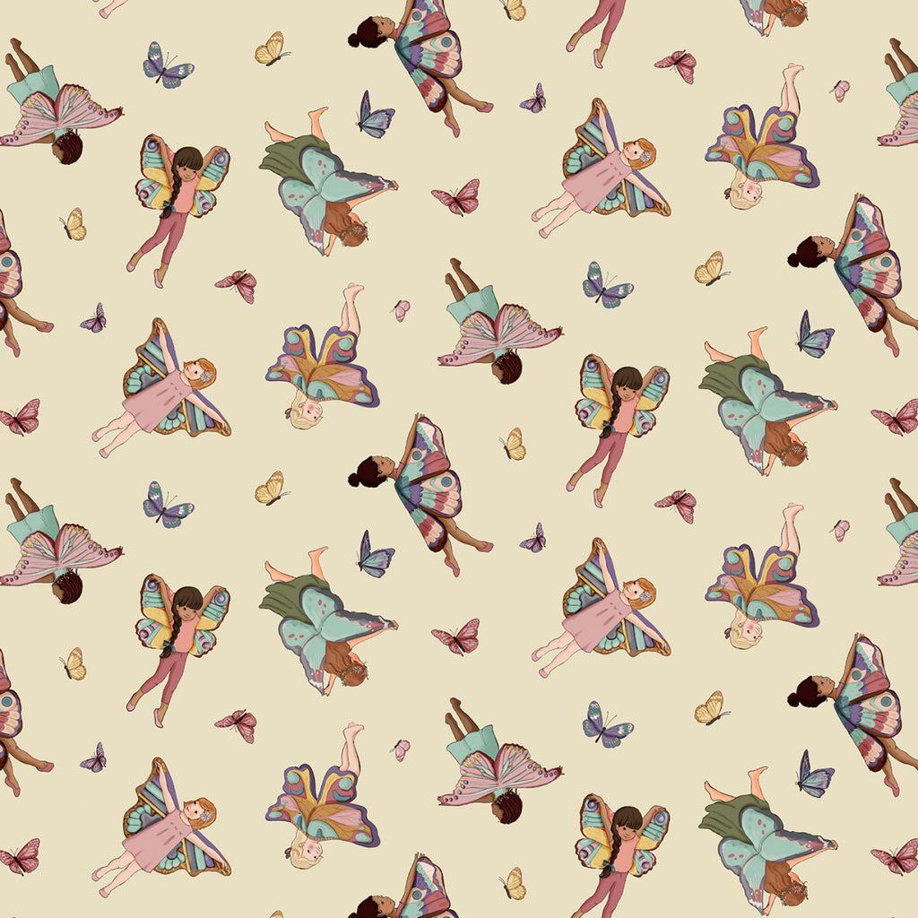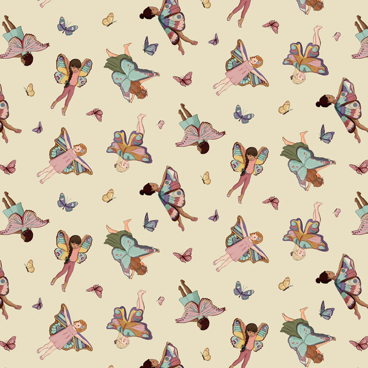 Whimsical butterfly-winged children flutter across a soft cream background in this charming print from Nocturnal Garden by Belle & Boo. Each illustrated girl is dressed in pastel tones with delicately patterned wings, surrounded by scattered butterflies in flight. The scattered layout and gentle palette make this print ideal for juvenile quilts, sweet apparel, or storybook-themed décor projects with a magical twist.
