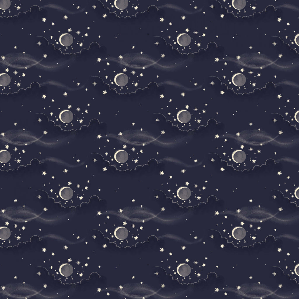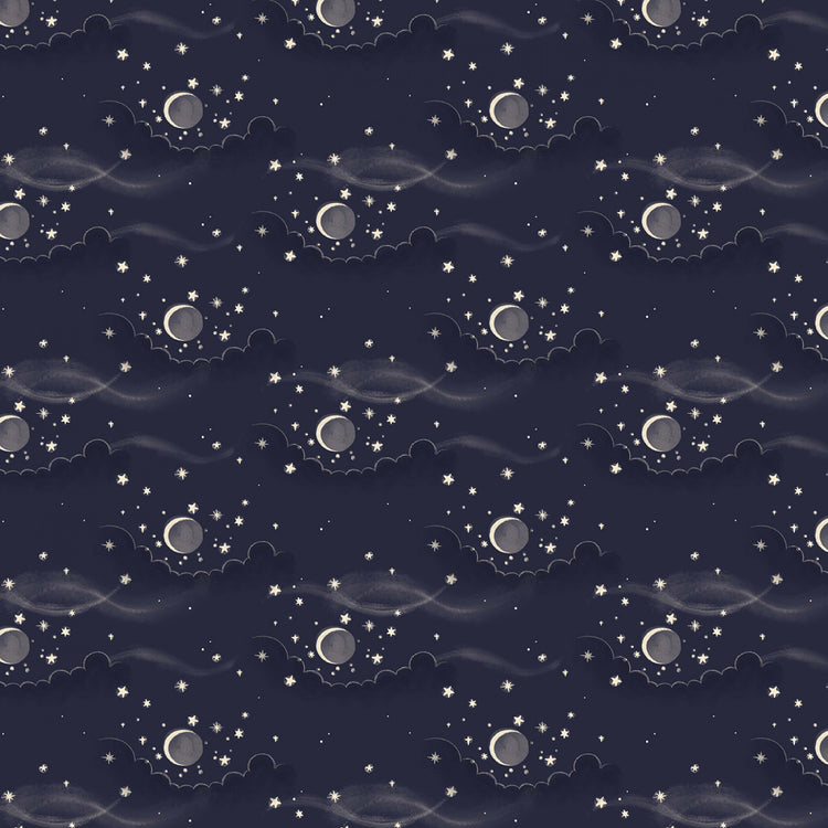 Moons and stars twinkle softly across a deep midnight sky in this dreamy coordinate from Nocturnal Garden. Painted with a gentle, misty effect, this celestial print features swirls of clouds, crescent moons, and scattered constellations in soft cream tones. It adds a magical nighttime touch to quilts, backings, and borders, and pairs beautifully with the storybook scenes from the rest of the collection.