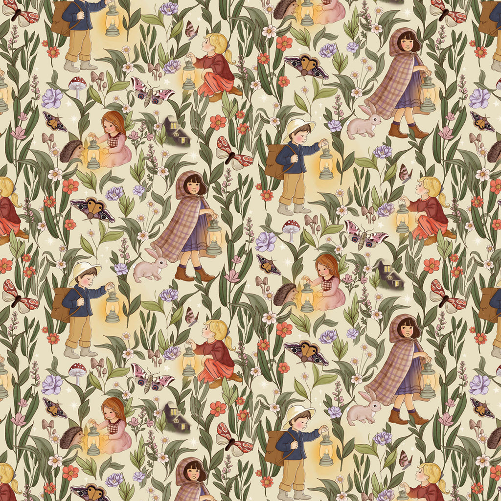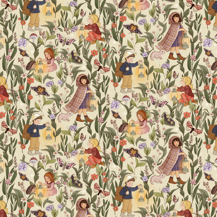 Children with lanterns wander through a moonlit garden in this enchanting print from Nocturnal Garden. Illustrated in Belle & Boo’s beloved storybook style, this design features kids in vintage clothing surrounded by tall wildflowers, fluttering butterflies and moths, and curious woodland creatures—all set against a soft cream background. Warm tones of plum, rust, and gold give the scene a nostalgic glow, making it a beautiful choice for storybook quilts, nursery décor, and handmade children’s accessories.