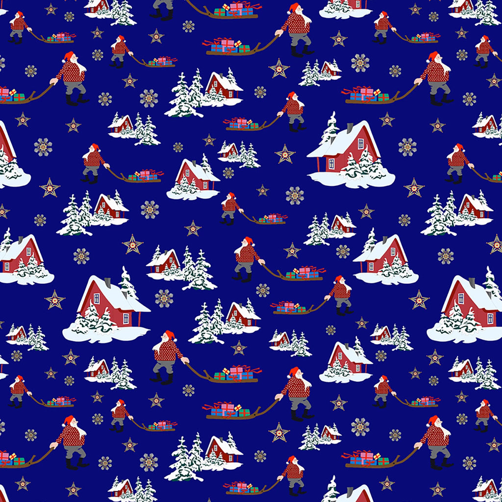 Set against a rich, wintry blue, this print features cheerful Julenisse figures—the traditional Norwegian Christmas gnome—pulling sleighs filled with gifts through a snowy village of red cabins and fir trees. Straw stars and snowflake-like florals are scattered throughout the scene, adding to the festive, folkloric charm. A beautiful Scandinavian take on classic holiday traditions.