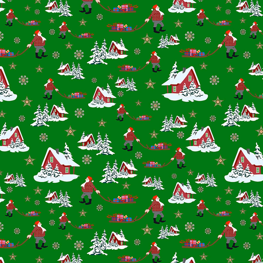 This festive print features traditional red Norwegian cabins nestled in snowy landscapes, with charming Julenisse figures (Scandinavian Christmas gnomes) pulling sleighs full of gifts. Accented by golden straw ornaments and snowy evergreens, the bright green background adds a cheerful contrast to the red and white motifs. A whimsical nod to Norwegian holiday traditions.