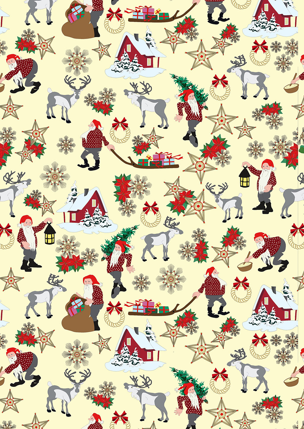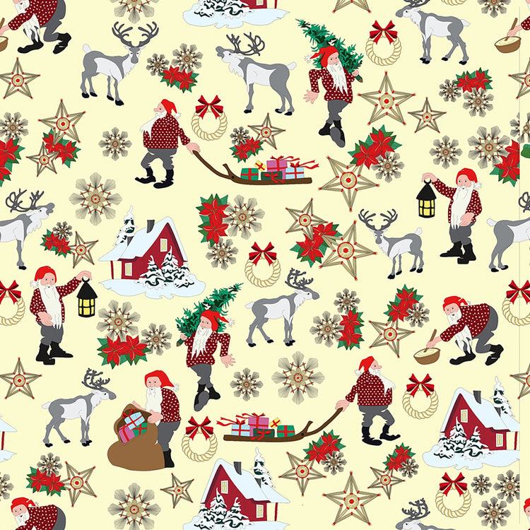 Celebrate the charm of a Nordic winter with this delightful print featuring gnomes in red hats, snowy cabins, reindeer, sleighs of presents, and Scandinavian-style straw ornaments. The soft cream background gives the whimsical scene a warm, vintage feel, while festive pops of red and green add holiday cheer. A beautiful storytelling print that captures the heart of Scandinavian folklore.