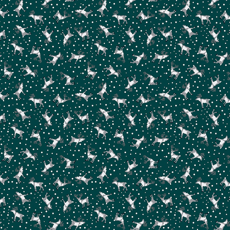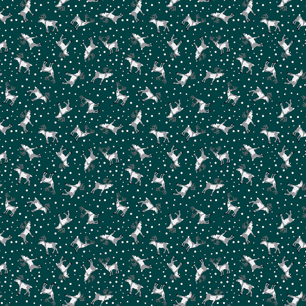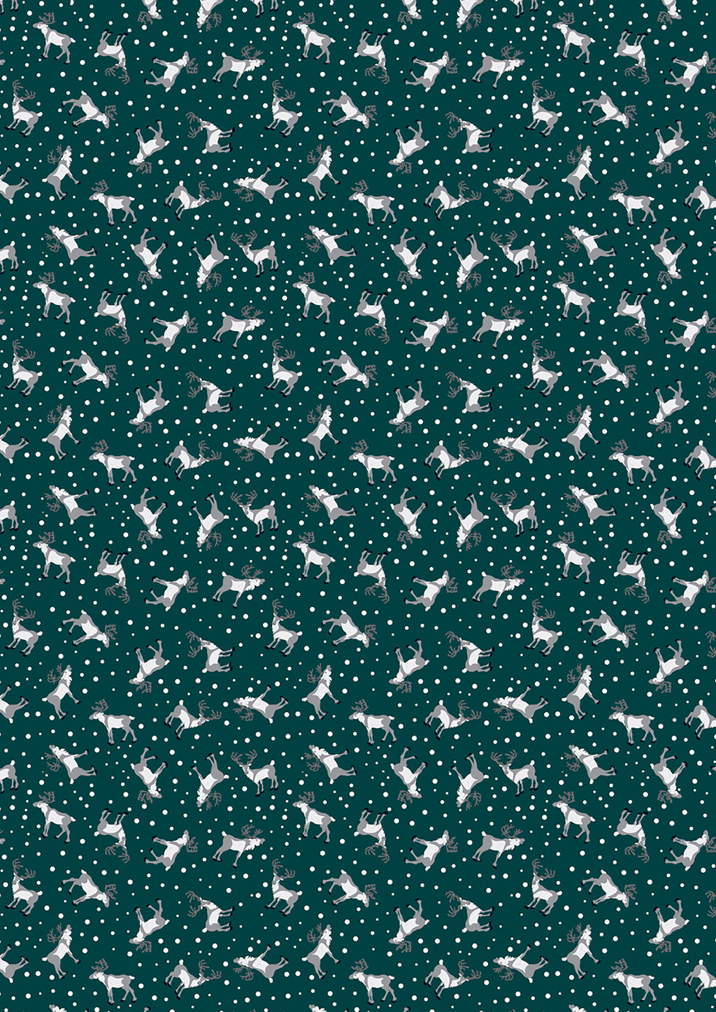 A rich forest green background hosts an all-over scatter of small, simple reindeer silhouettes. The design is clean and evenly spaced, with a soft tonal texture that adds quiet dimension without distracting from the print. It’s a versatile blender for traditional holiday palettes and coordinates beautifully with other prints from the Norwegian Christmas collection.