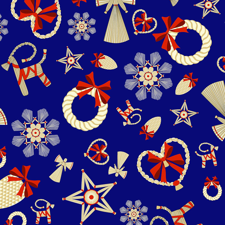 This bold blue background sets the stage for beautifully illustrated Scandinavian straw ornaments in a large-scale layout. Featuring braided wreaths, heart shapes, stars, angels, and Yule goats tied with cheerful red bows, the design captures the warmth and handmade charm of Nordic holiday traditions. The contrast between the classic motifs and vibrant blue adds a fresh, eye-catching twist.