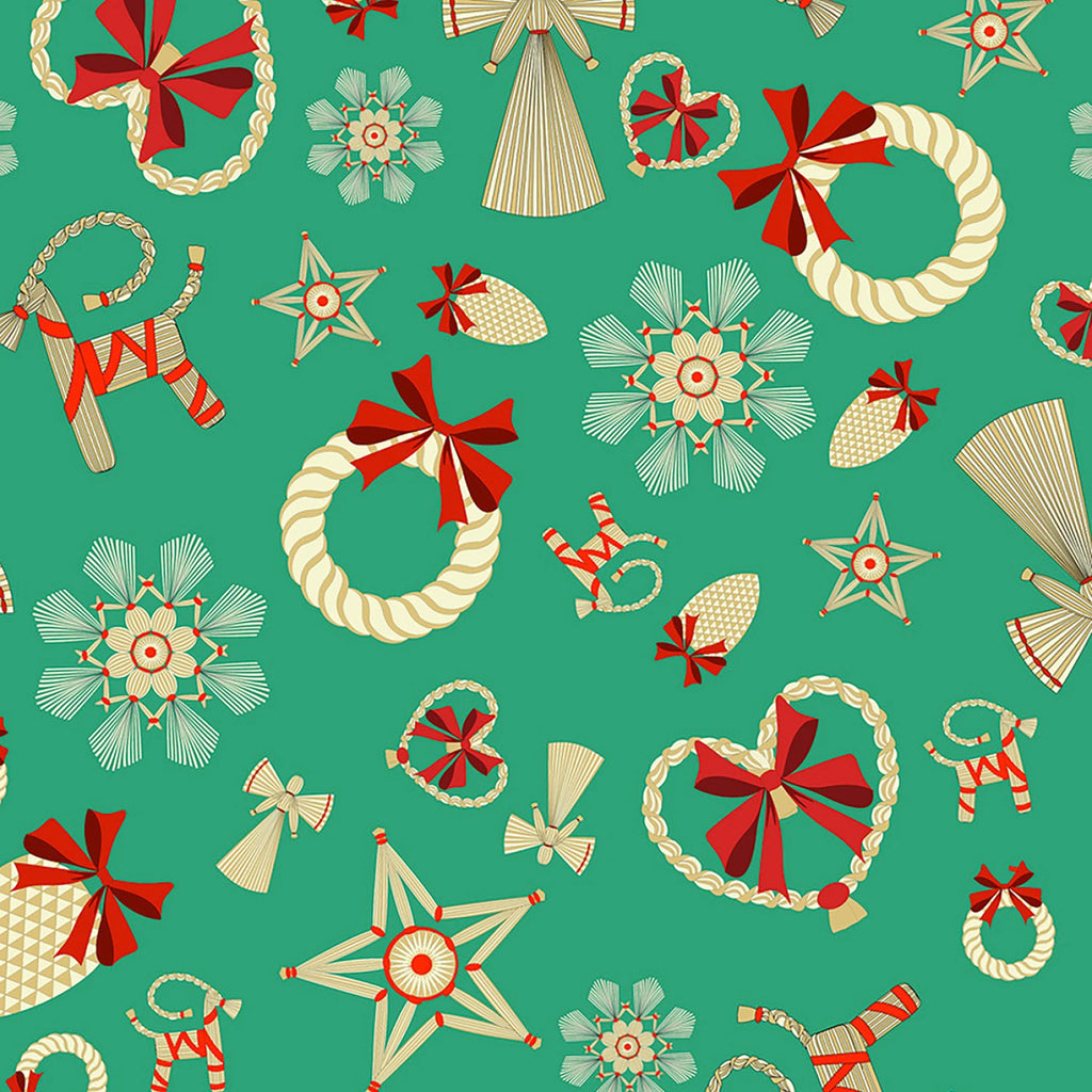 This festive print features large-scale Scandinavian straw ornaments—stars, hearts, wreaths, goats, and angels—scattered across a rich green backdrop. The designs are detailed with warm tones and cheerful red bows, echoing the traditional charm of Nordic Christmas décor. The artwork has a hand-crafted, folk art feel that brings a cozy and nostalgic touch to seasonal projects.
