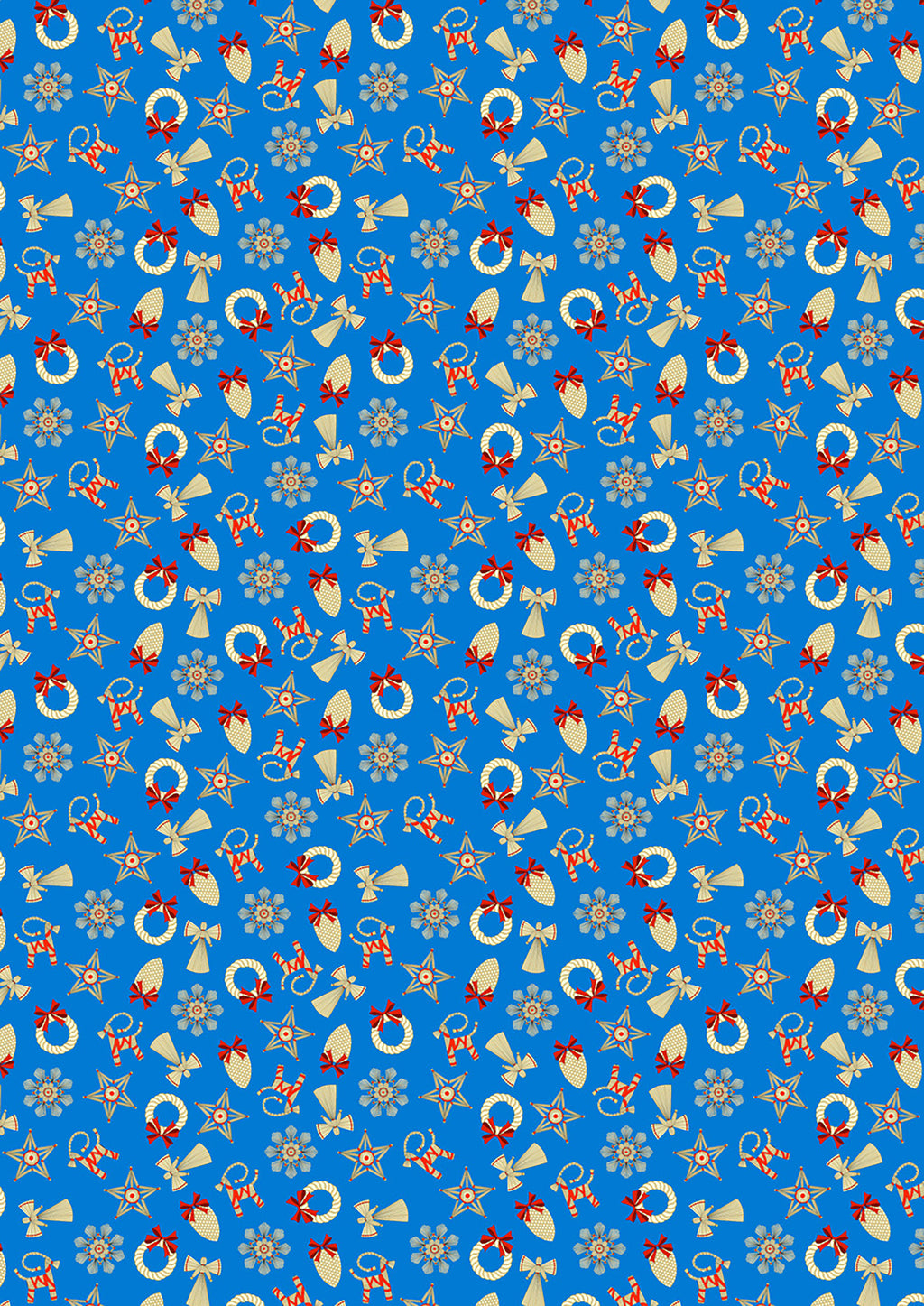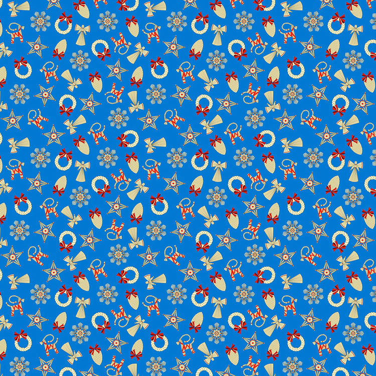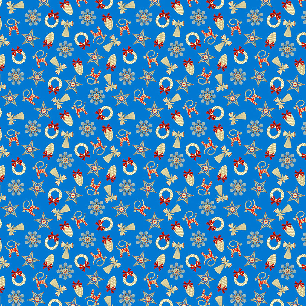 This festive print displays a scattered arrangement of straw ornaments, bows, hearts, and edelweiss-style flowers in warm neutrals and classic red—set against a cheerful sky blue backdrop. The traditional Nordic motifs have a handcrafted look that celebrates Scandinavian holiday traditions. The small, evenly spaced elements make this print easy to use as a supporting fabric in holiday projects.