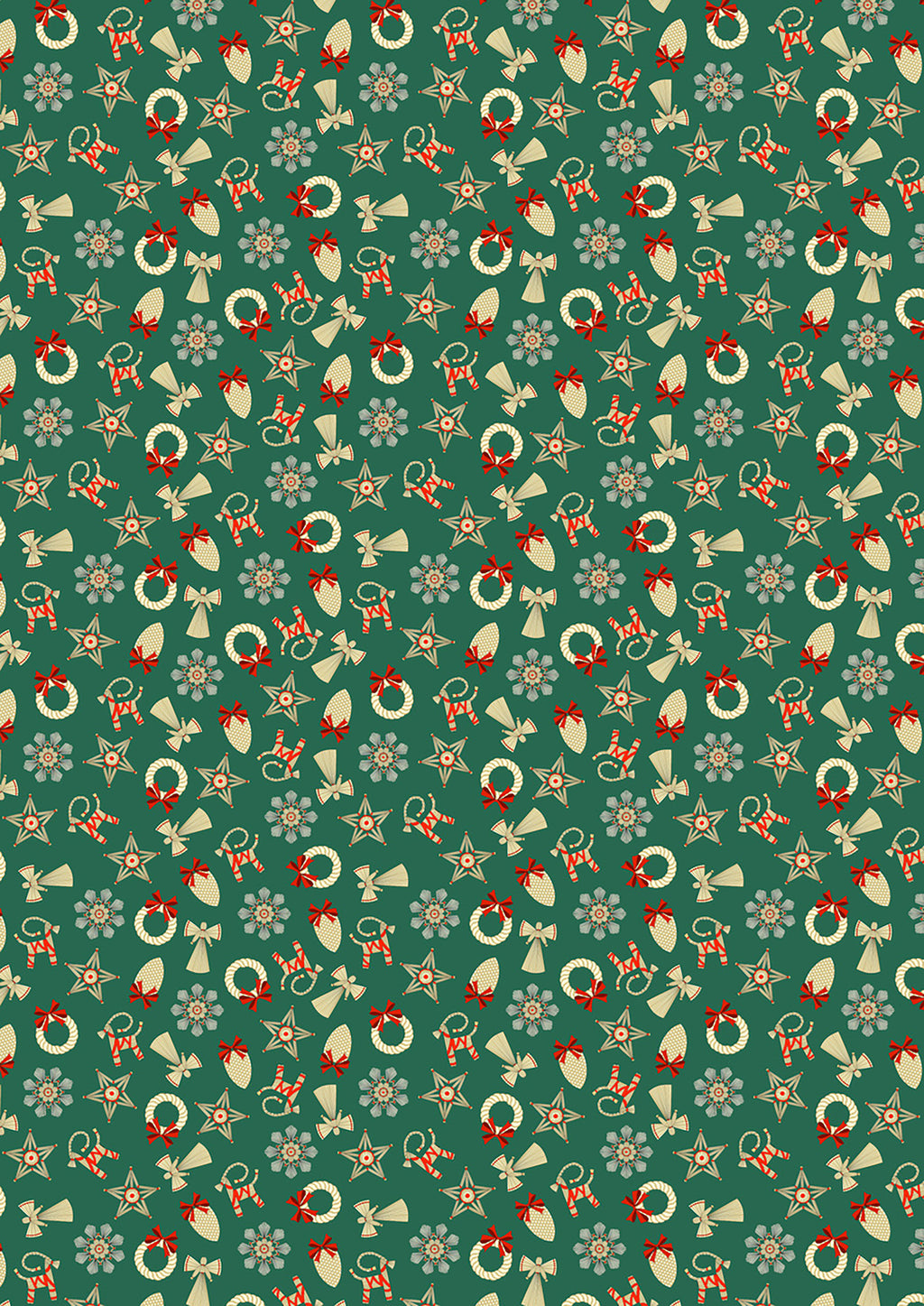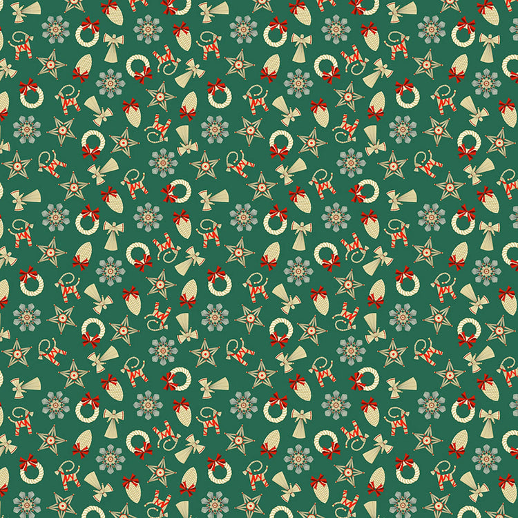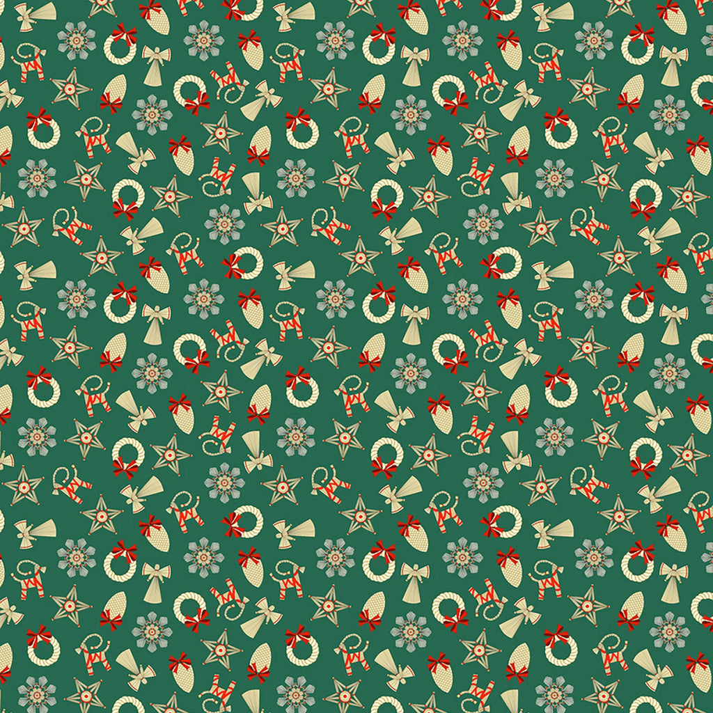 This small-scale print features a lively toss of Scandinavian straw ornaments—stars, wreaths, pinecones, hearts, and bows—set against a classic pine green background. The cream, red, and natural straw tones give it a traditional handmade look with folk art charm. It pairs beautifully with the rest of the Norwegian Christmas collection but is perfectly suited for smaller accents due to the tight repeat.