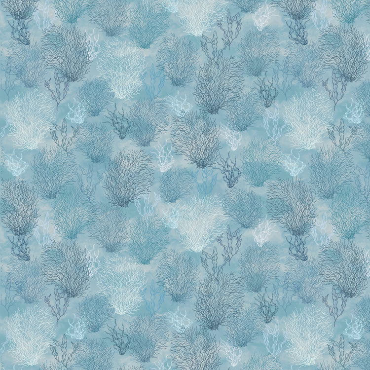 Delicate coral branches in shades of aqua and navy sway across a watery blue background, creating an enchanting undersea effect. This design from Ocean Song by Whistler Studios brings movement and texture, perfect for quilts, seaside décor, and ocean-inspired accessories. Printed on 100% quilting cotton, it pairs beautifully with the mermaid and sea life prints in the collection.