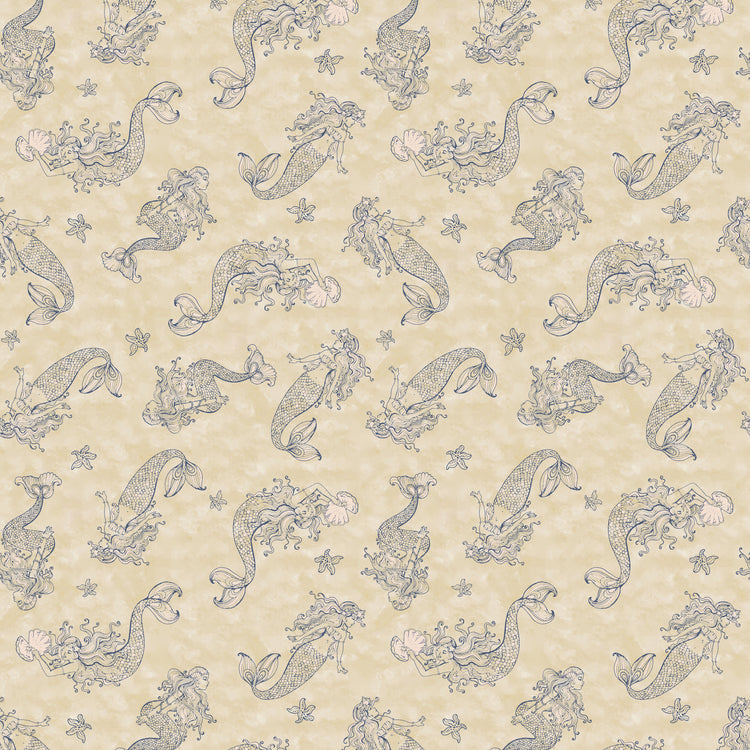 Playful line-drawn mermaids float across a sandy beige background in this whimsical print from Ocean Song by Whistler Studios. Accented with seashells and starfish, the design has a hand-illustrated look that pairs beautifully with the collection’s bolder ocean scenes. Printed on 100% quilting cotton, it’s a charming choice for quilts, children’s projects, and coastal décor.