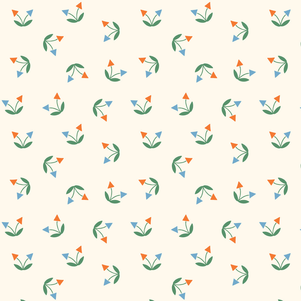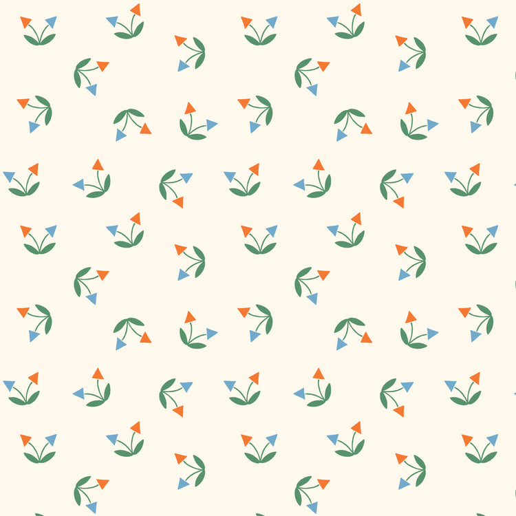 This charming fabric features a delightful ditsy floral pattern with small, stylized flowers in vibrant shades of orange, blue, and green scattered across a soft cream background. Perfect for quilting or crafting, this fabric's design brings a touch of whimsy and color to any project, making it an excellent choice for both traditional and modern designs.