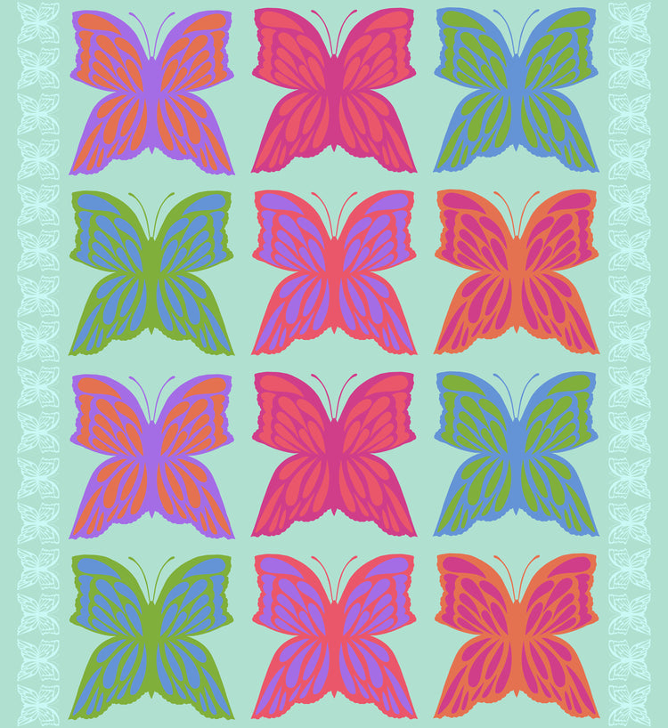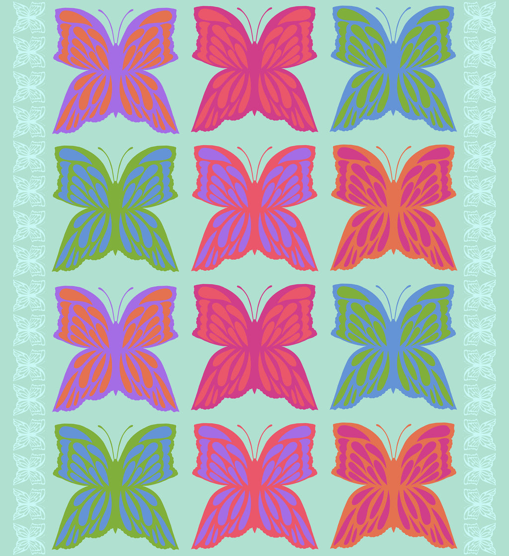 6 O’Clock – Pale from Overdressed by Anna Maria features bold, graphic butterflies in a softer, fresh palette that feels playful yet sophisticated. The large-scale repeat creates strong visual impact, making it ideal for statement quilts, garments, bags, and modern home décor. Printed as continuous running yardage on 100% cotton quilting fabric with a smooth, crisp hand, it’s perfect for quilting and sewing.