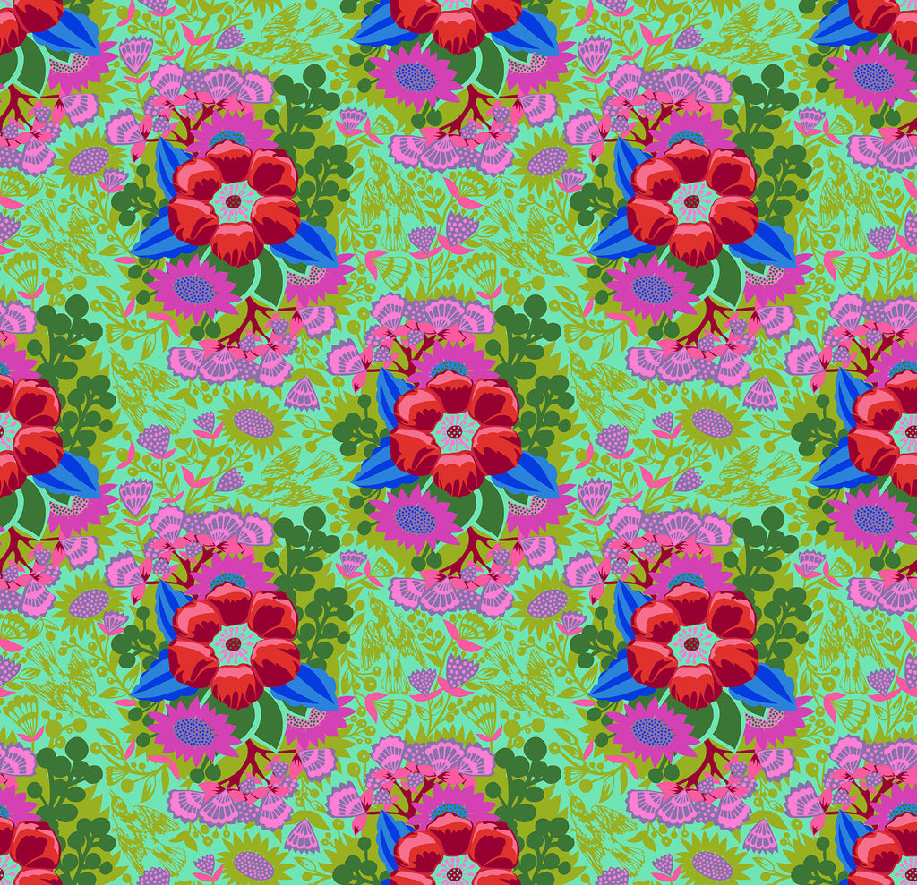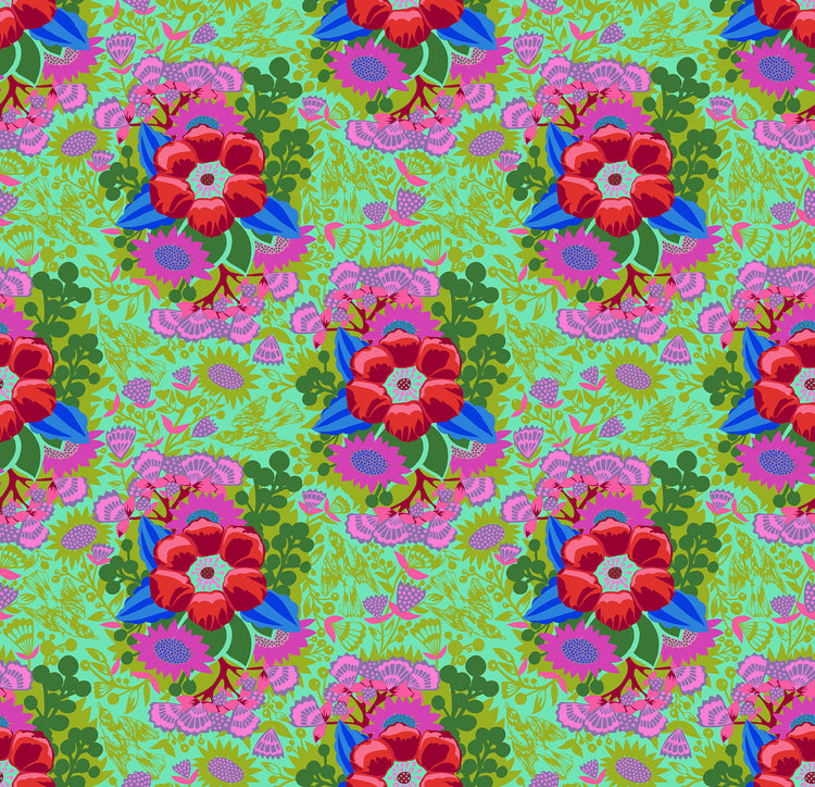 Centerpiece – Limerick from Overdressed by Anna Maria is a bold, large-scale floral on 100% cotton quilting fabric, with blooms measuring approximately 6–8” across. Bright red and pink flowers pop against a fresh green ground with blue, lavender, and berry accents, creating lively contrast and saturated color. Ideal for statement quilt blocks, wide borders, quilt backs, garments, and bags where you want vibrant energy and modern floral impact.
