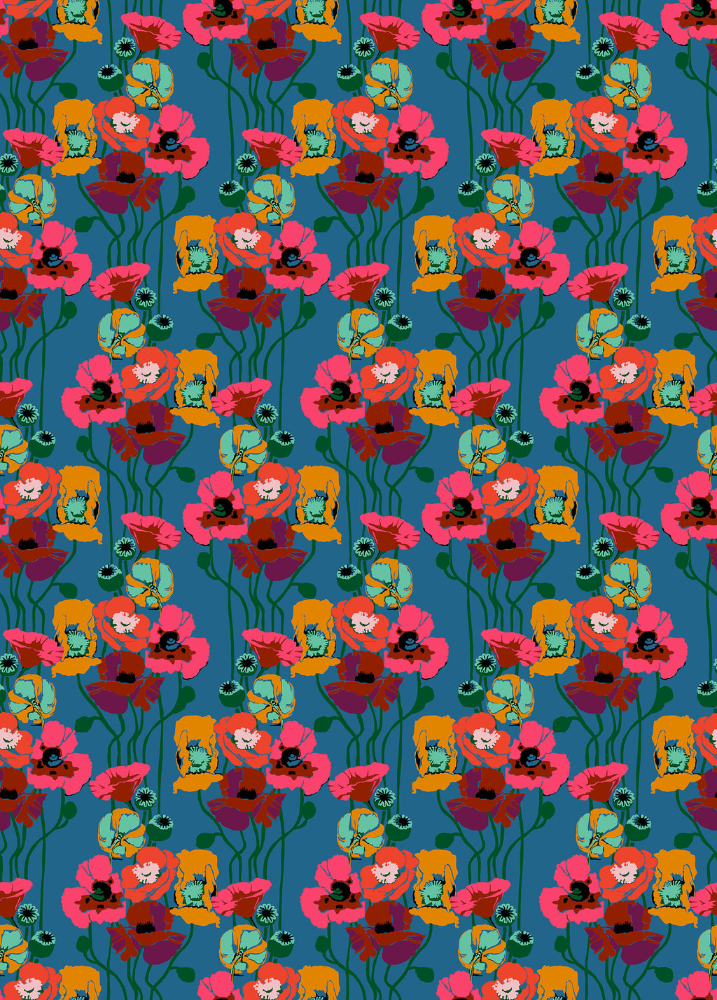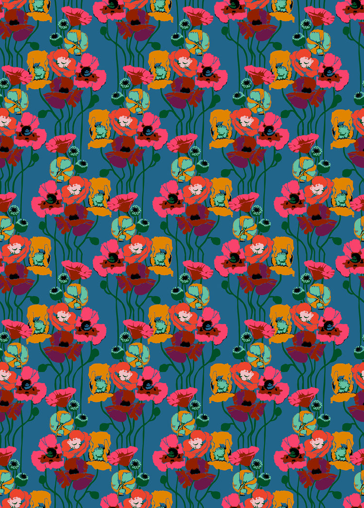 Pouring Poppies – Paint from Overdressed by Anna Maria features flowing, painterly florals on 100% cotton quilting fabric with a rich, moody palette. Coral, orange, and rose blooms drift across a deep teal ground, creating bold contrast and dramatic movement. The graceful vertical layout is ideal for borders, garments, bags, and quilt designs where you want depth, color, and expressive floral energy.