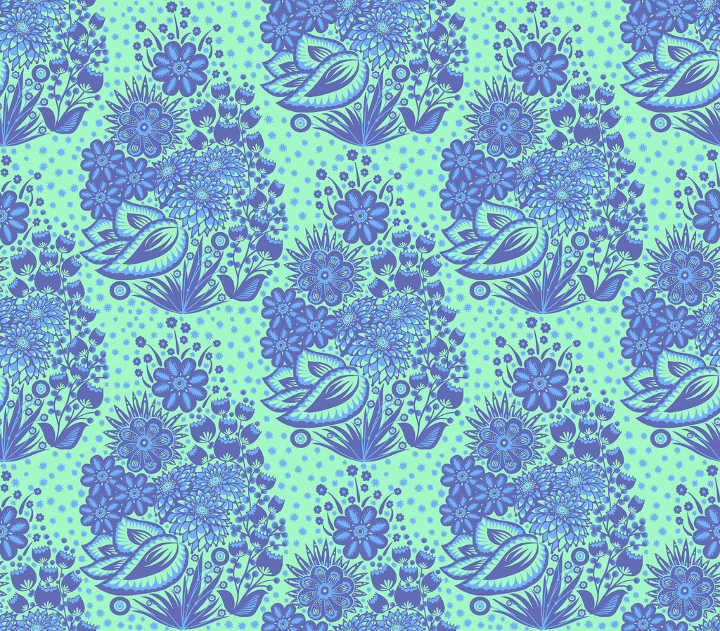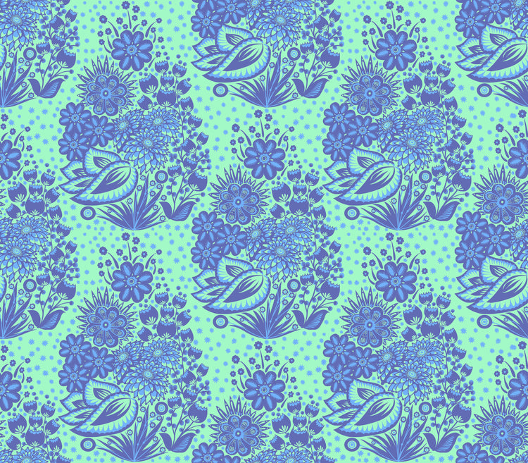 Totem – Blue from Overdressed by Anna Maria features layered floral and folk-inspired motifs in rich shades of blue and aqua for a bold, decorative look. The medium-scale repeat makes it ideal for statement quilts, borders, and modern projects while still blending easily with other prints. Printed on 100% cotton quilting fabric with a smooth, crisp hand, it’s perfect for quilts, home décor, and sewing.
