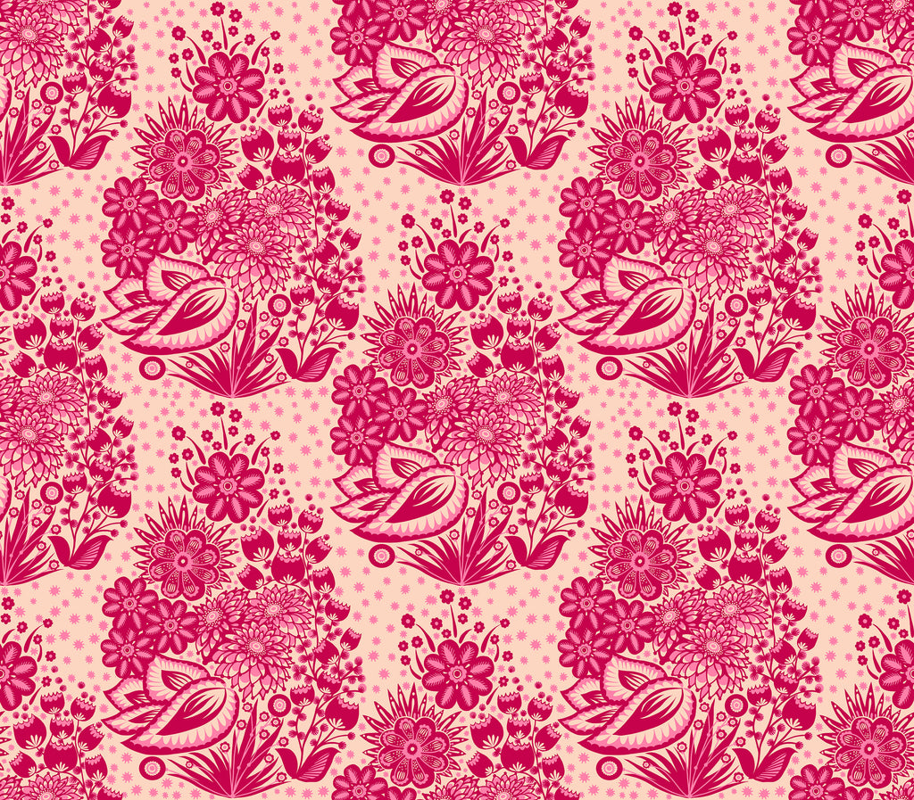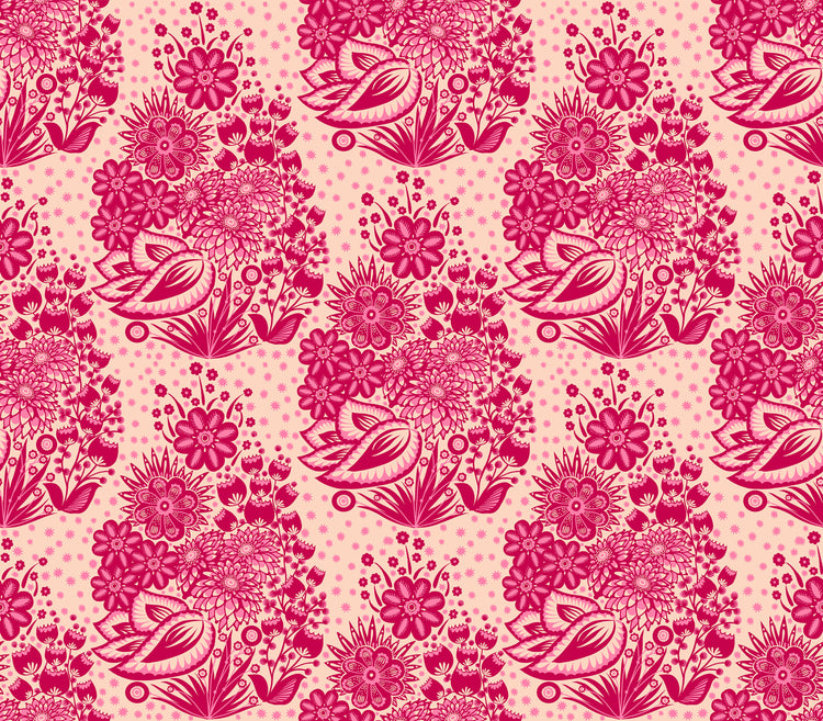 Totem – Red from Overdressed by Anna Maria is a bold, tonal floral on 100% cotton quilting fabric, featuring layered folk-inspired blooms and botanical motifs. Saturated red and pink tones create depth and movement against a soft blush background, giving the print a rich, artful feel. Perfect for quilt blocks, borders, garments, bags, and as a vibrant blender to add warmth and cohesion to colorful projects.