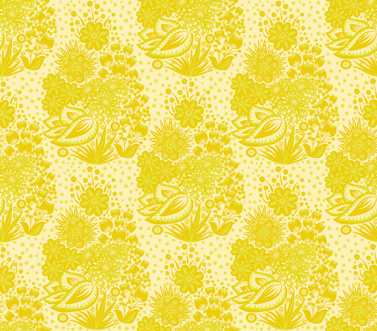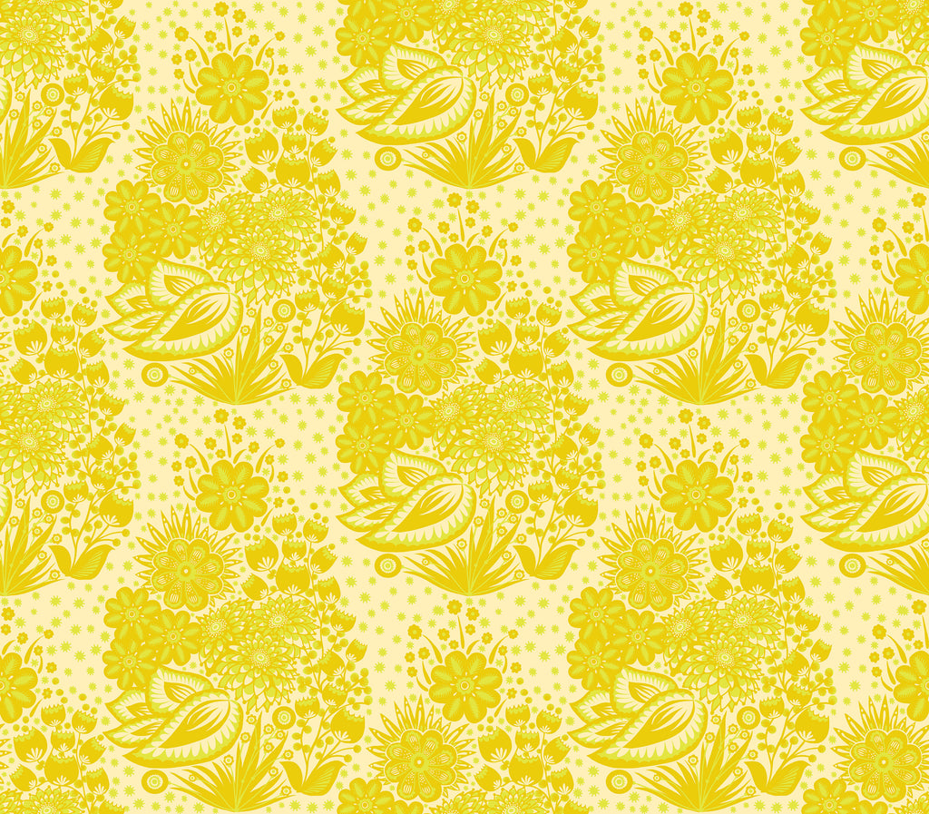 Totem – Yellow from Overdressed by Anna Maria features layered floral and folk-inspired motifs in warm golden and citrus tones for a bright, uplifting look. The medium-scale repeat works beautifully for statement quilts, borders, and modern projects while still blending easily with other prints. Printed on 100% cotton quilting fabric with a smooth, crisp hand, it’s perfect for quilts, home décor, and sewing.