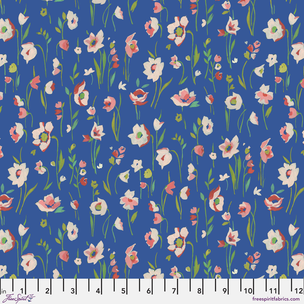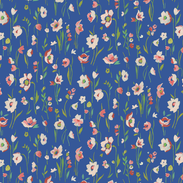 This print features red, white, and pink flowers on a blue background. 100% Cotton. 44" Wide.
