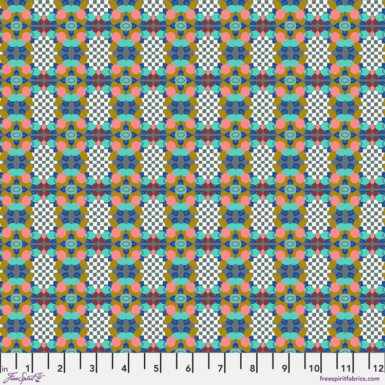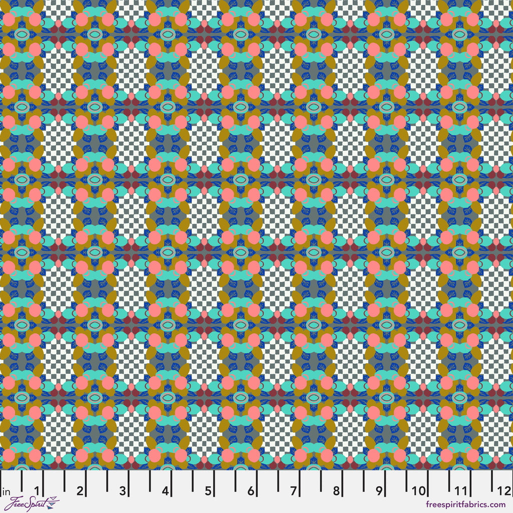 This playful geometric print by Nathalie Lété features a lively grid of floral medallions layered over a black-and-white checkerboard pattern. The mix of pink, blue, teal, and mustard creates a vibrant, slightly surreal energy that feels both retro and modern. 100% cotton, perfect for bold quilts, eclectic décor, or statement accents.