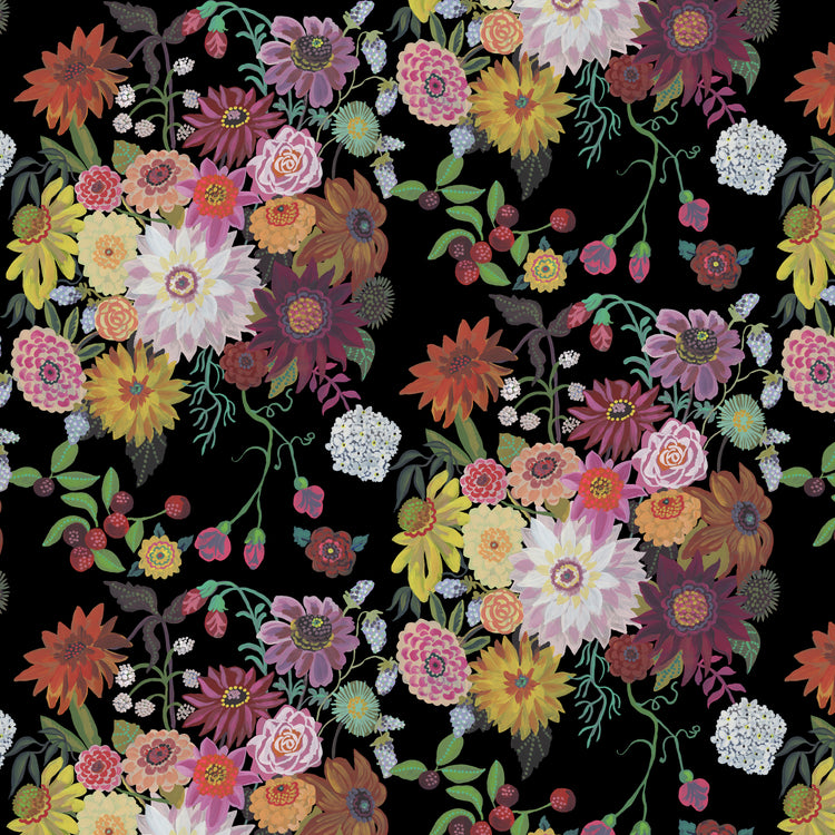 This dramatic floral by Nathalie Lété features painterly blooms in soft pinks, golds, and violets against a deep black background. The hand-painted details and lush layering give it a moody, vintage-garden feel that’s both romantic and expressive. 100% cotton, ideal for striking quilts, elegant apparel, and statement décor.