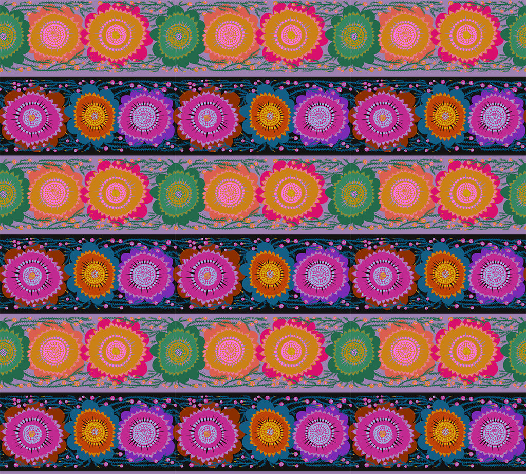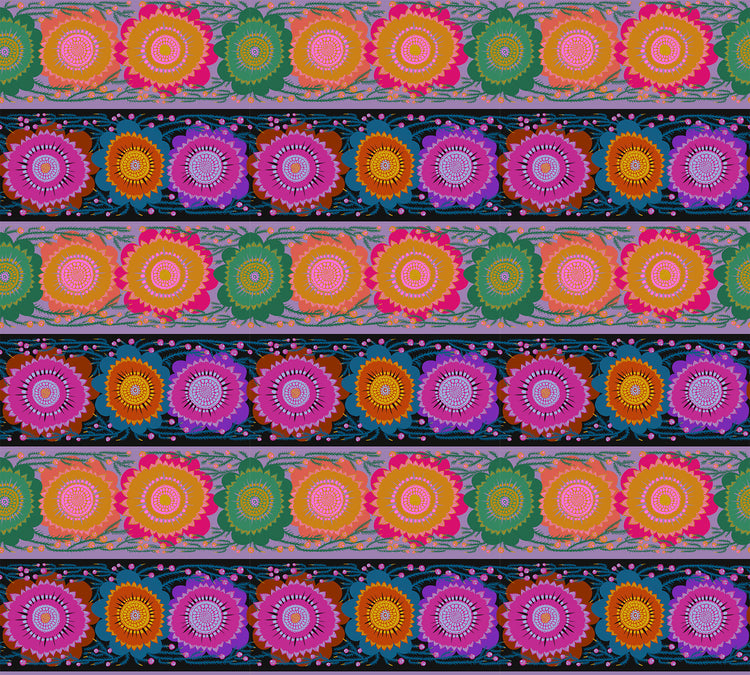 This vibrant border print from Anna Maria’s Perennial Borders collection, crafted by Northcott, features large floral medallions arranged in alternating light and dark horizontal bands. Bright pinks, oranges, greens, and purples create a striking layered effect that makes this design ideal for quilt borders, wide decorative bands, statement bag panels, and bold accent projects. The repeating stripes add movement and color while coordinating beautifully with the rest of the Perennial Borders collection.
