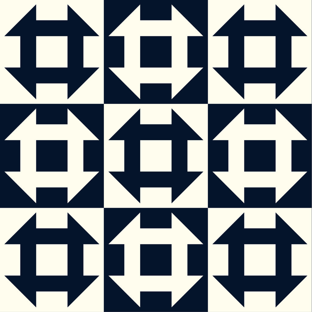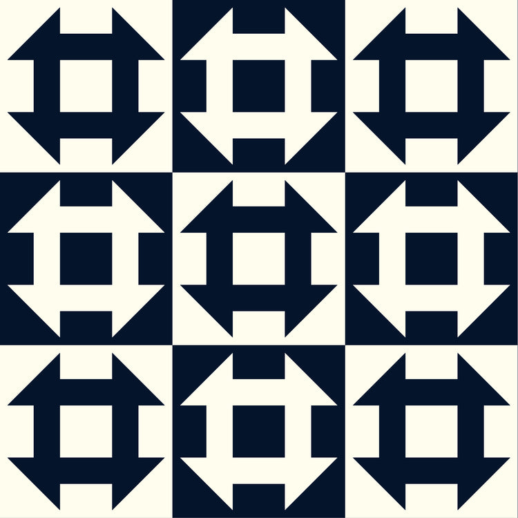 This striking two-color print features oversized Churn Dash blocks arranged in a bold checkerboard layout of navy and cream. Designed to mimic the look of classic patchwork without the piecing, it’s ideal for whole-cloth quilts, borders, bag panels, and home décor projects. The crisp geometric shapes offer strong visual contrast while still reading as a timeless, traditional motif. Printed on soft, high-quality cotton with a large-scale repeat that makes a beautiful statement in both modern and vintage-inspired quilts.