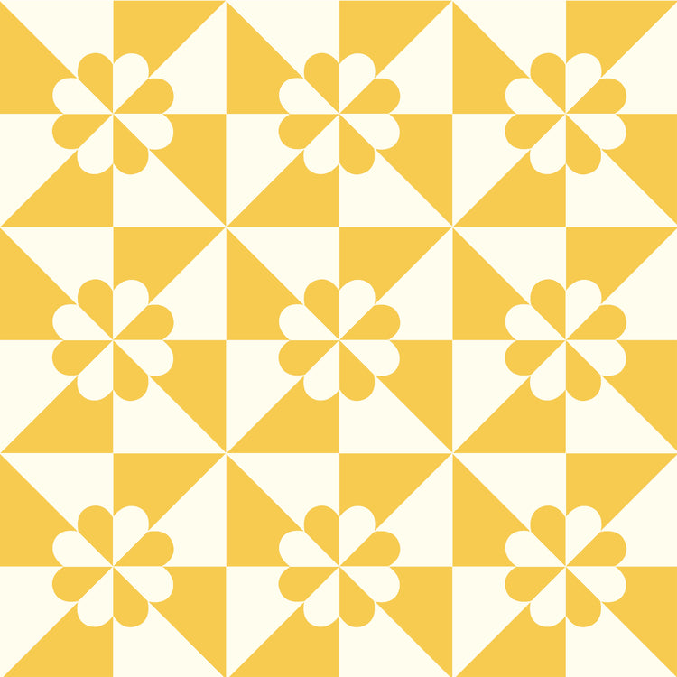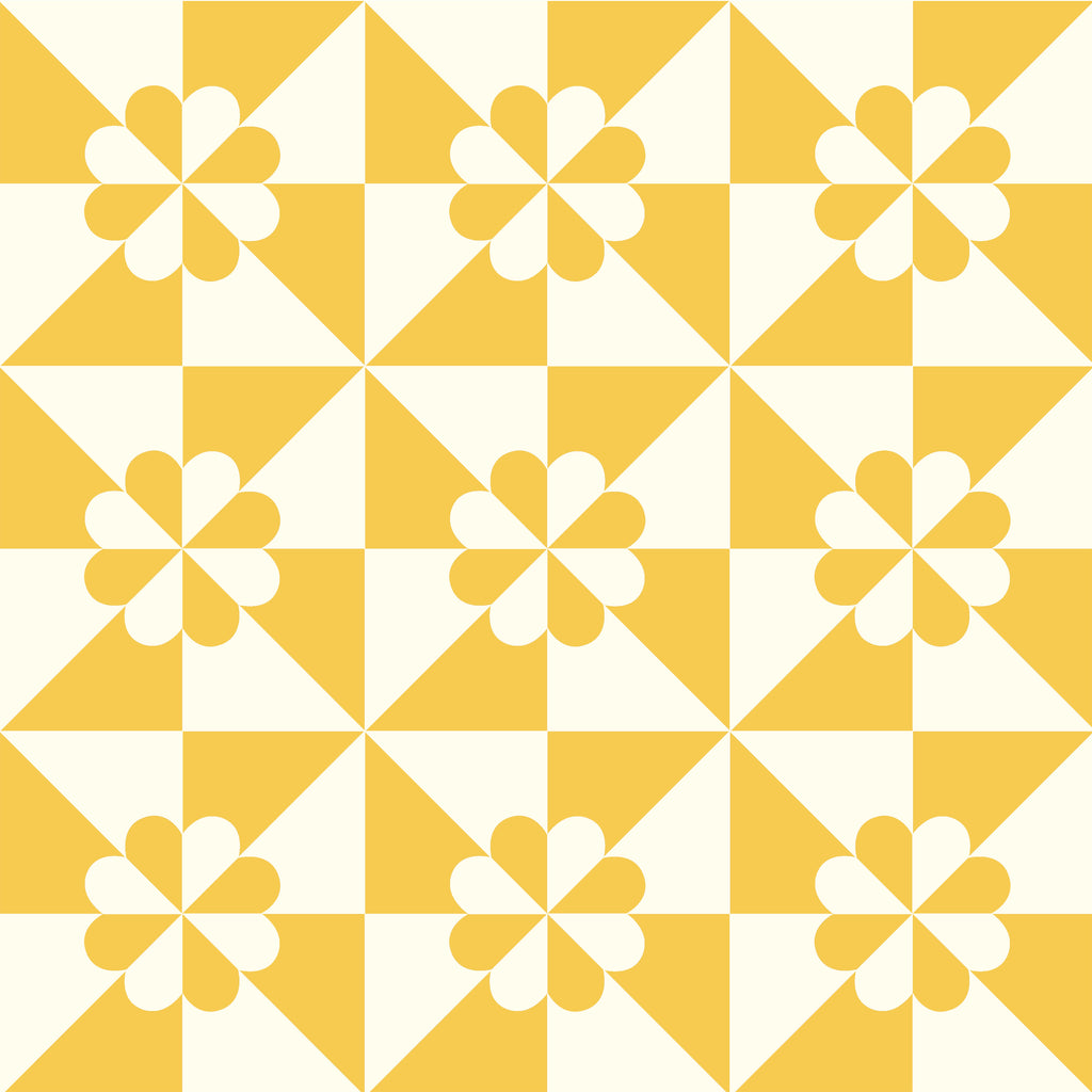 This sunny two-color print features the classic Hearts and Gizzards quilt block reimagined in warm golden yellow and cream. Pinwheel-style triangles and petal-like centers create a rhythmic, high-contrast pattern with a clean, modern edge. The bold, large-scale repeat makes it ideal for whole-cloth quilts, statement borders, throw pillows, and cheerful home décor accents. Printed on 100% cotton and part of the Perfect Points II collection by Windham Fabrics, it brings a bright vintage charm to any project.