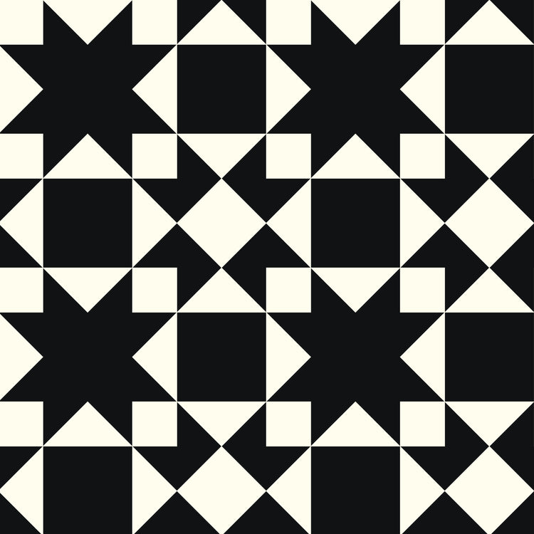 This striking two-color print features oversized Sawtooth Star blocks arranged in a bold patchwork-style layout of black and cream. The sharp star points and crisp geometric lines bring classic quilt styling to life without any piecing required, making it perfect for whole-cloth quilts, borders, bags, and décor projects. Its high-contrast palette gives it a timeless, vintage feel while the large-scale repeat adds strong visual impact in both modern and traditional designs. Printed on soft, premium cotton with beautifully defined shapes.