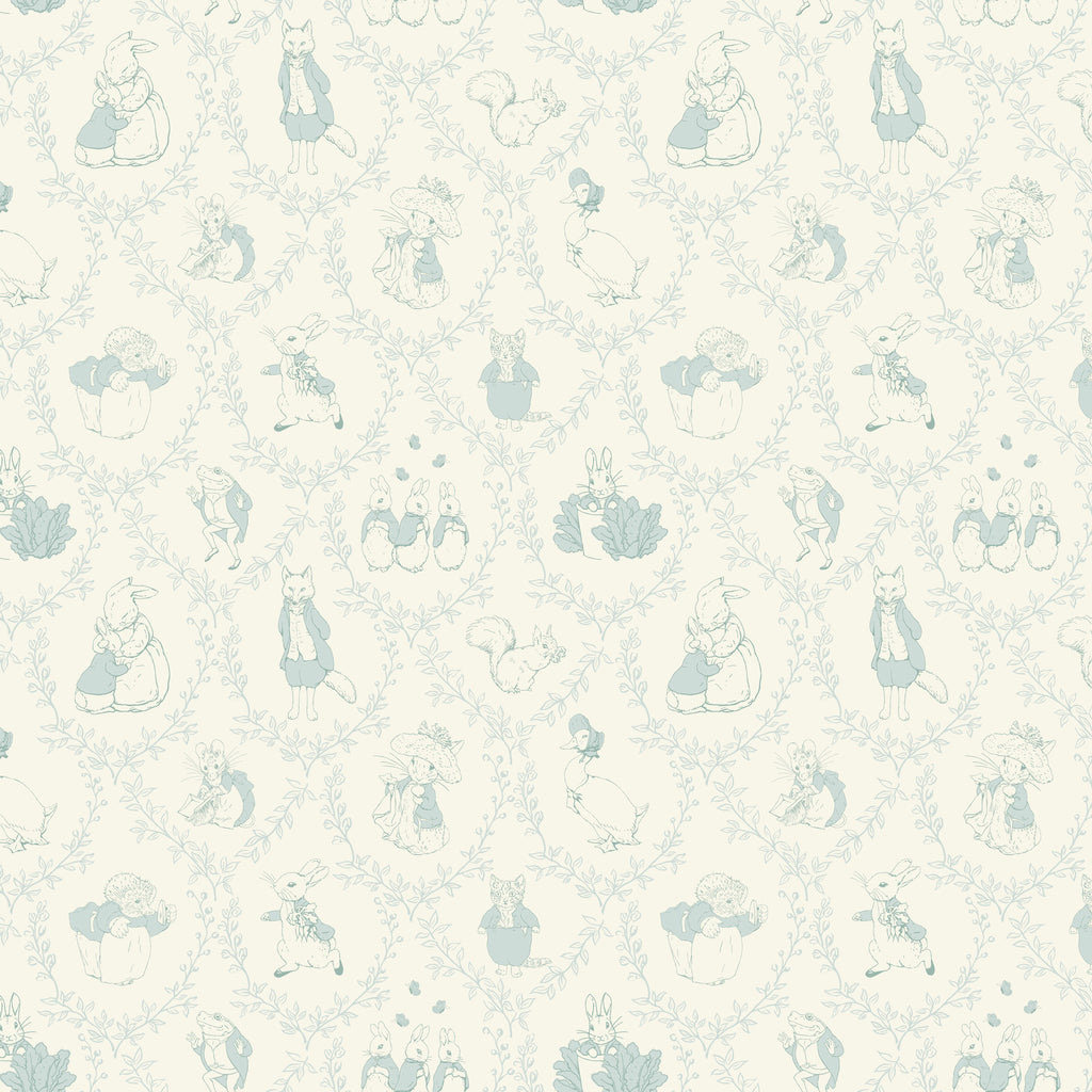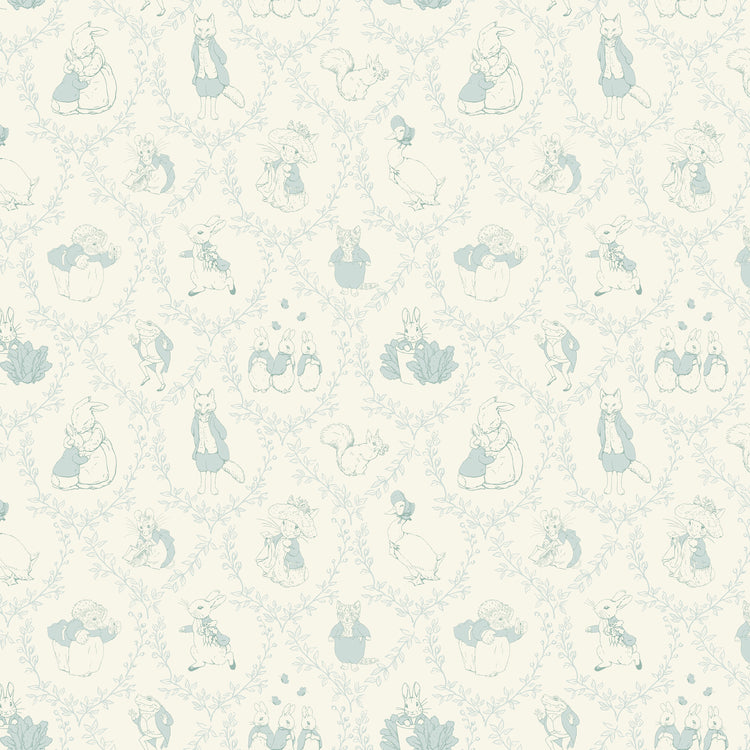 This print features a damask pattern with characters from Peter Rabbit. Official licensed product. BEATRIX POTTER™.