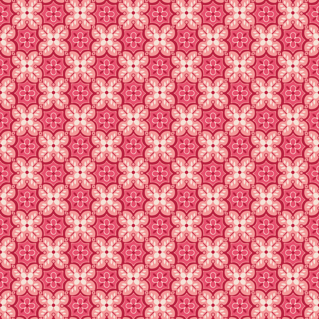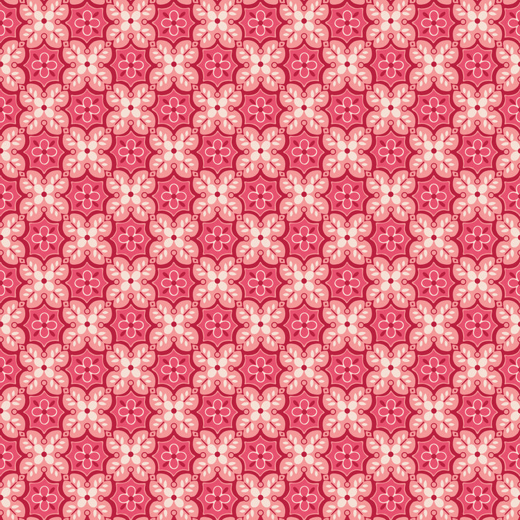 This fabric features a charming design of interlocking floral motifs in warm shades of pink and red, forming a vintage-inspired pattern that feels both delicate and eye-catching. The structured layout gives it a subtle geometric appeal, while the floral details add softness and nostalgia. Printed on quality cotton, it's an ideal choice for quilts, apparel, and home décor with a timeless, cottage-style look.
