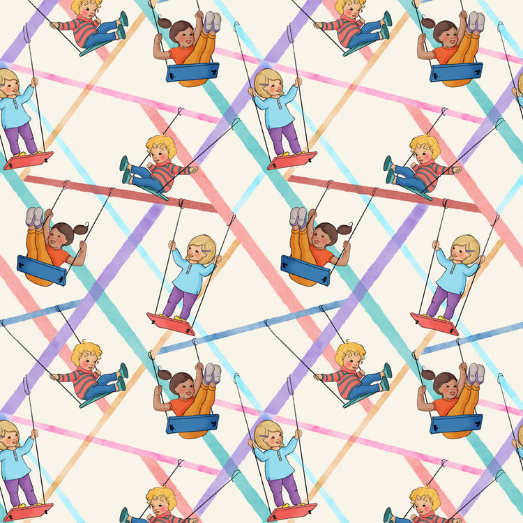 This delightful fabric features a whimsical design of children swinging on colorful swings, set against a light cream background. The pattern is arranged in a diagonal grid, creating a playful and dynamic visual effect. Each child is depicted in vibrant, cheerful colors, adding a joyful and lively touch to any project. Ideal for creating children's clothing, quilts, or home decor, this fabric brings a sense of fun and innocence to your creations.