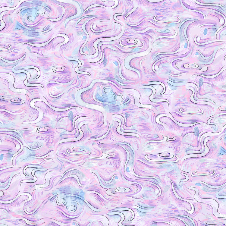 This 100% cotton fabric from Pondside Pals by Jeremiah Ketner features a gentle ripple design in soft lavender, pink, and blue tones. The painterly flow and light watercolor effect create a serene, abstract texture that works beautifully as a coordinate or background for quilts and artistic sewing projects.