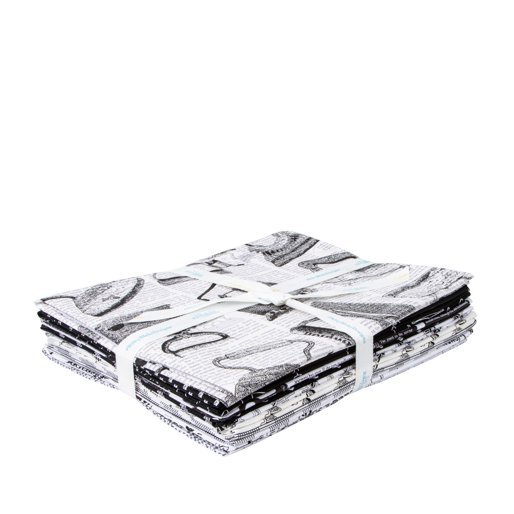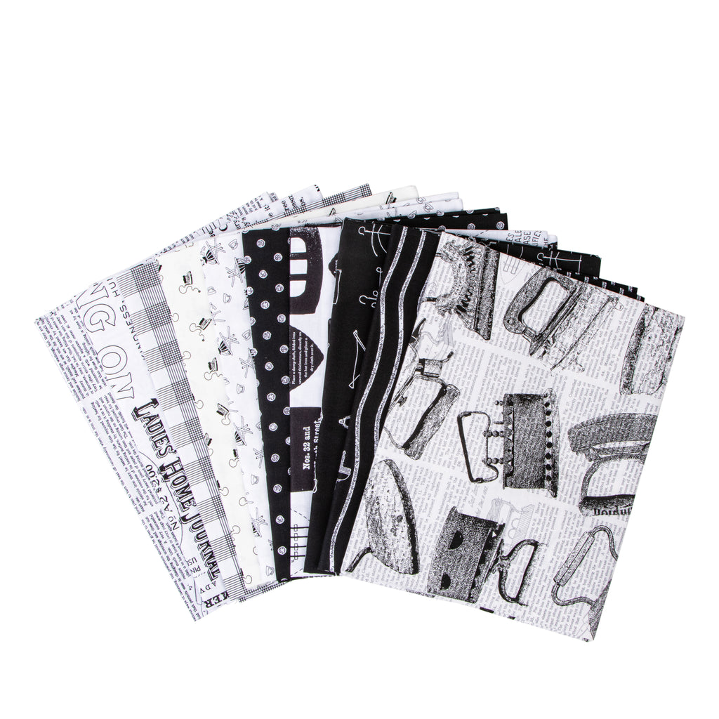 This Press On 1-Yard Bundle in Black by J. Wecker Frisch features 10 striking prints from the collection, all in a bold black colorway. Packed with vintage sewing motifs, antique irons, typewriter text, and graphic elements, this bundle offers a dramatic and nostalgic palette perfect for statement quilts and sewing room decor. Each yard gives you plenty of fabric for borders, backings, bags, and larger-scale projects.