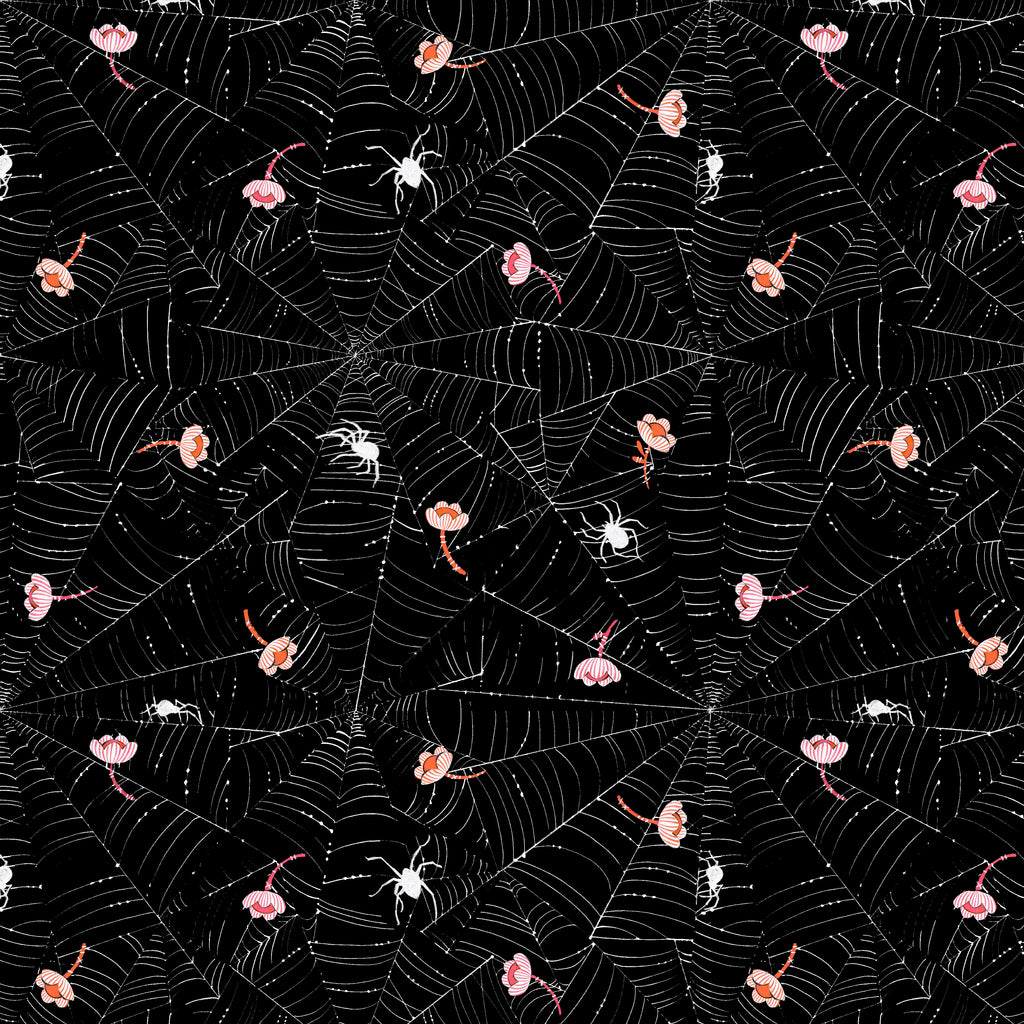 This print features a striking design of intricate spiderwebs interwoven with delicate flowers on a rich black background, offering a beautiful contrast of spooky and floral elements.