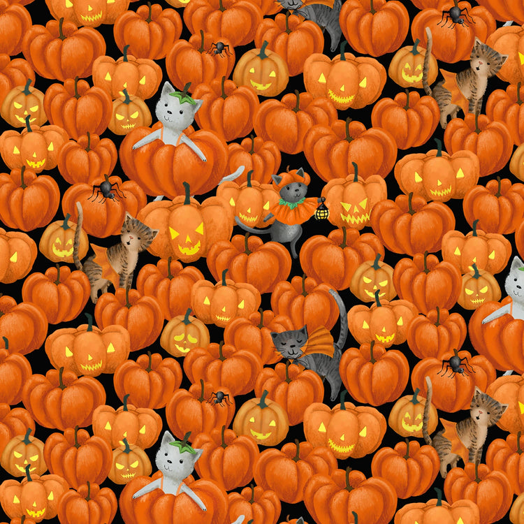 This vibrant fabric features a playful Halloween theme with an array of orange pumpkins, each with a mischievous jack-o'-lantern face. Amidst the pumpkins, you'll find adorable cats dressed in various costumes, adding a whimsical touch to the design. The background is a deep black, which makes the bright orange pumpkins and the detailed costumes of the cats stand out vividly, creating a festive and fun atmosphere perfect for holiday crafting or themed apparel.