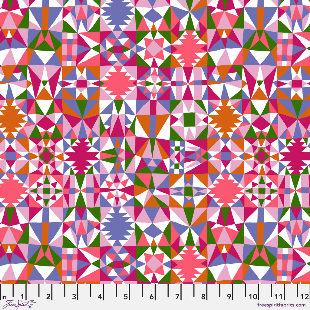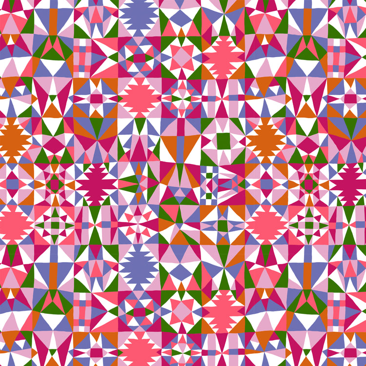 This fabric from Monika Forsberg’s Rising Tide collection features a playful arrangement of star-like shapes that echo traditional quilt blocks with a whimsical twist. Set against a soft pink background, the hand-drawn motifs create a rhythmic, geometric pattern that brings warmth and charm to any project. It’s a perfect choice for quilters who love modern prints with a nod to classic design.